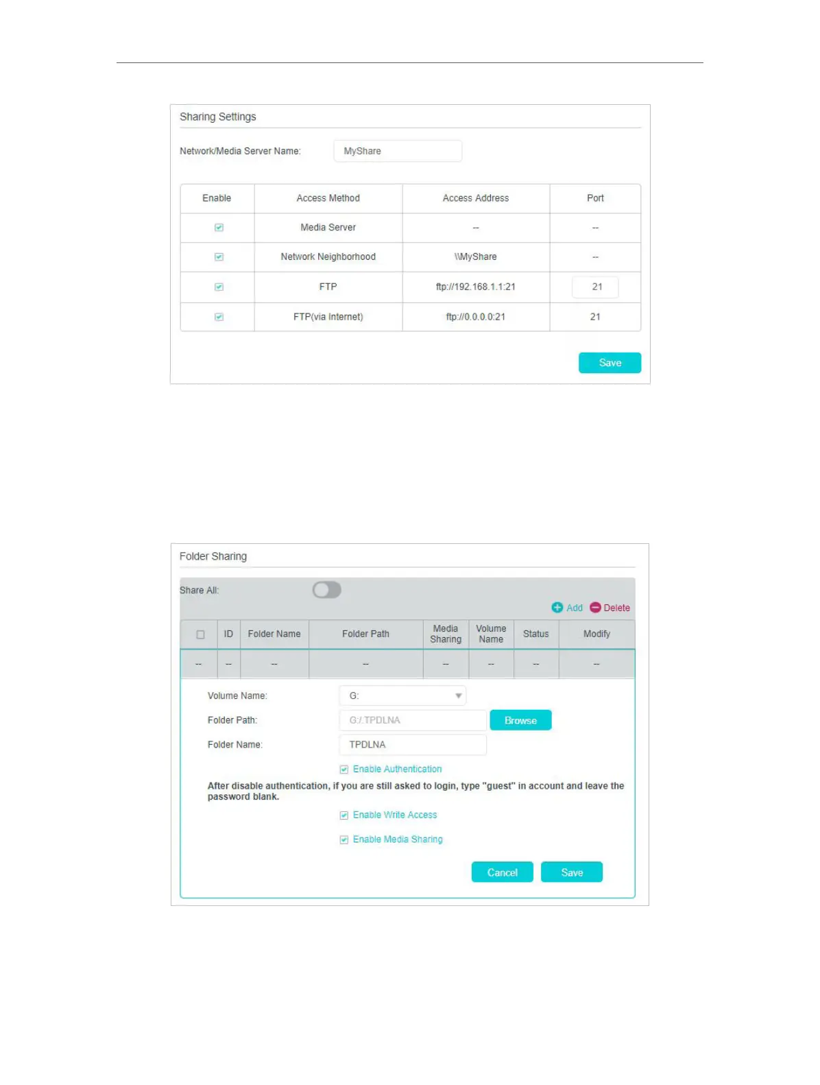 Add to add a new sharing folder.