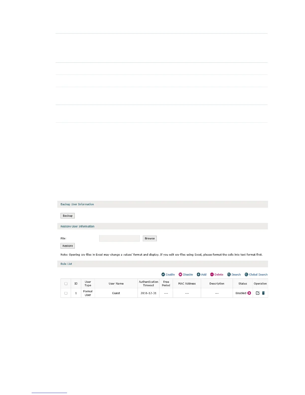 Click Backup to backup all the local users’ information into a CSV file in ANSI coding format.