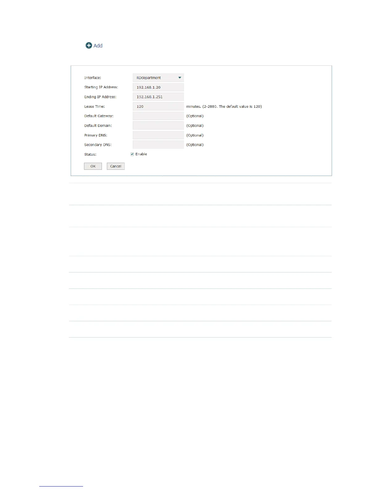 Lease Time Enter the time duration of the IP address assigned by the DHCP server between