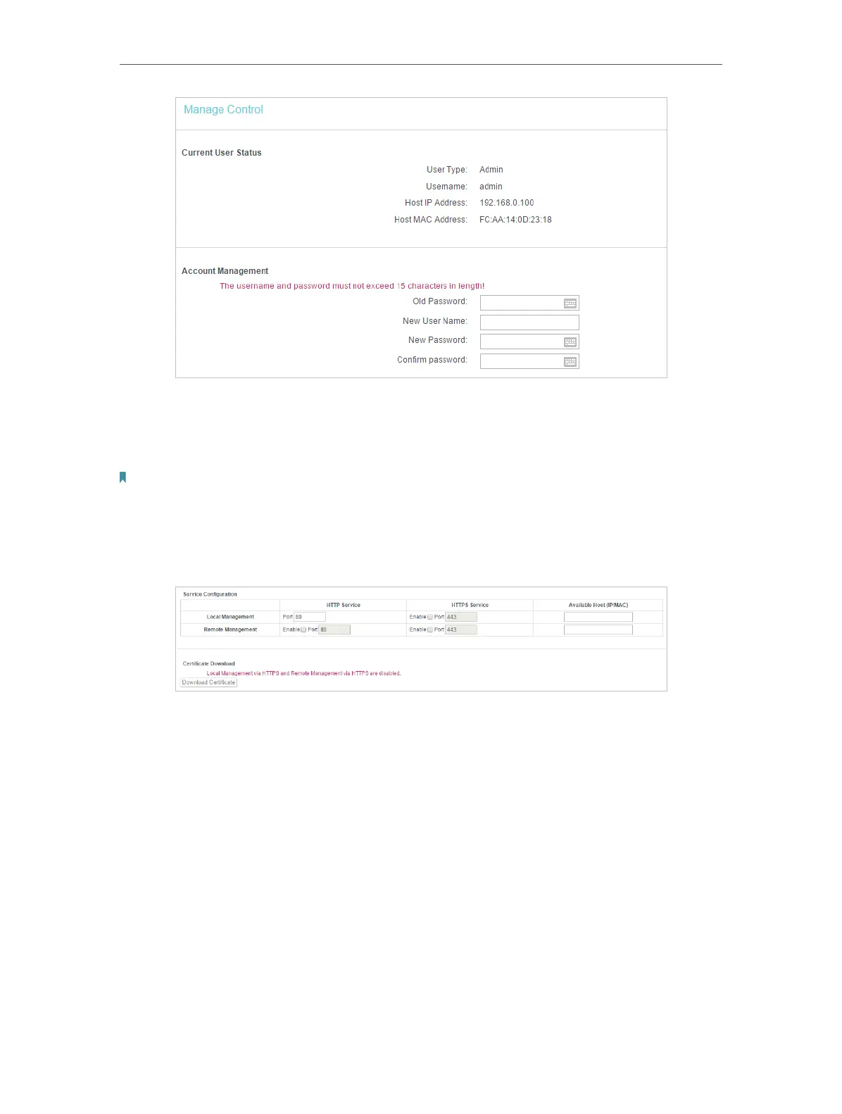 • Port - The default management web port number is 80 for HTTP, 443 for HTTPS.