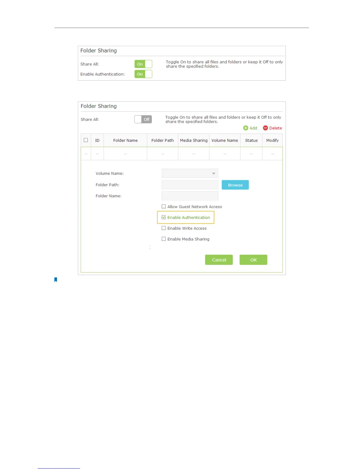 • If Share All is disabled, enable Authentication for specific folders.