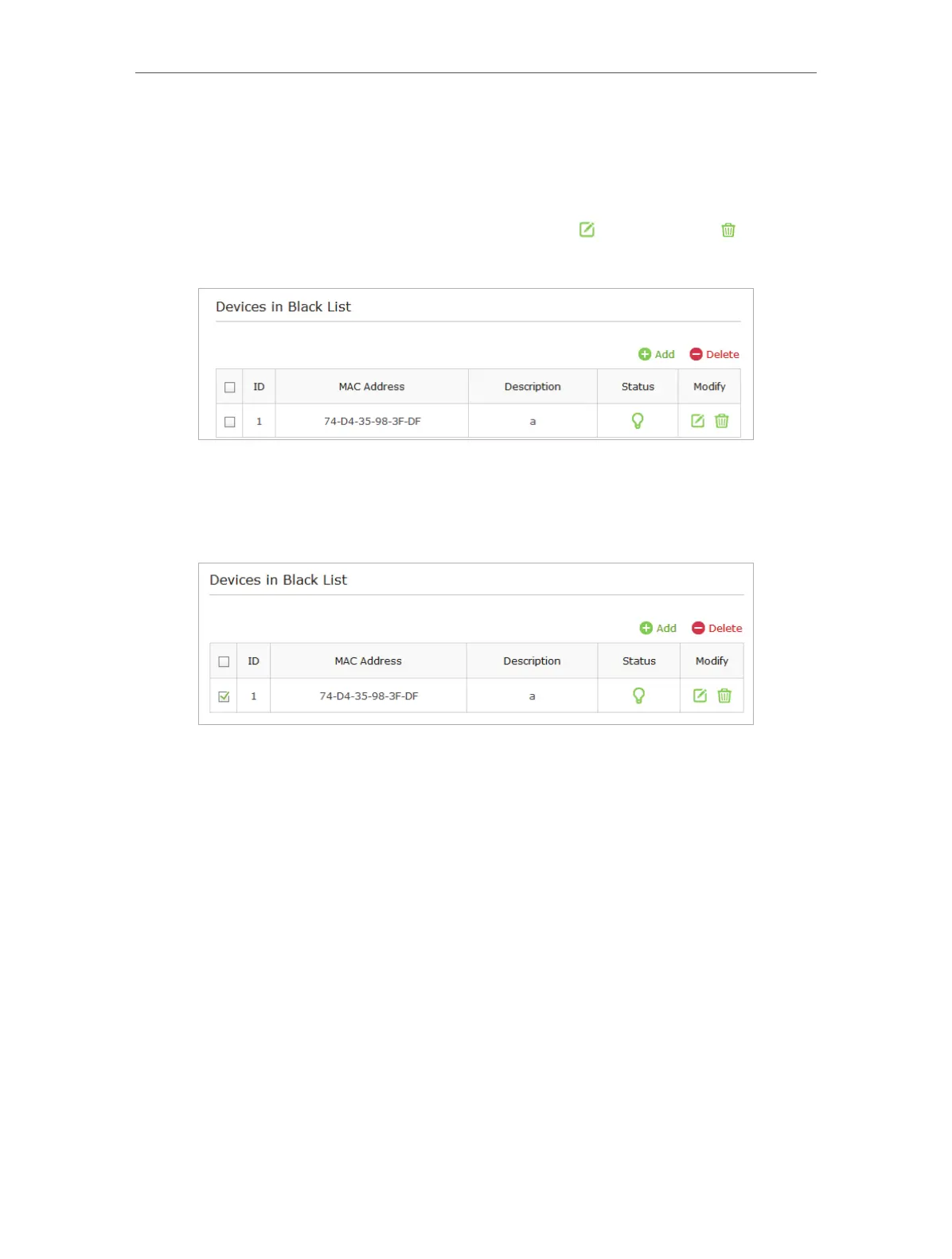 In the Blacklist or Whitelist, select the corresponding checkboxes of the devices to