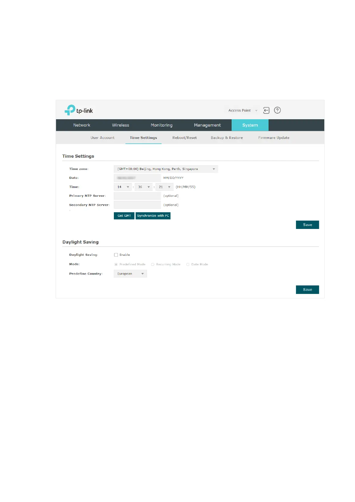 To configure the system time, go to the System > Time Settings page.