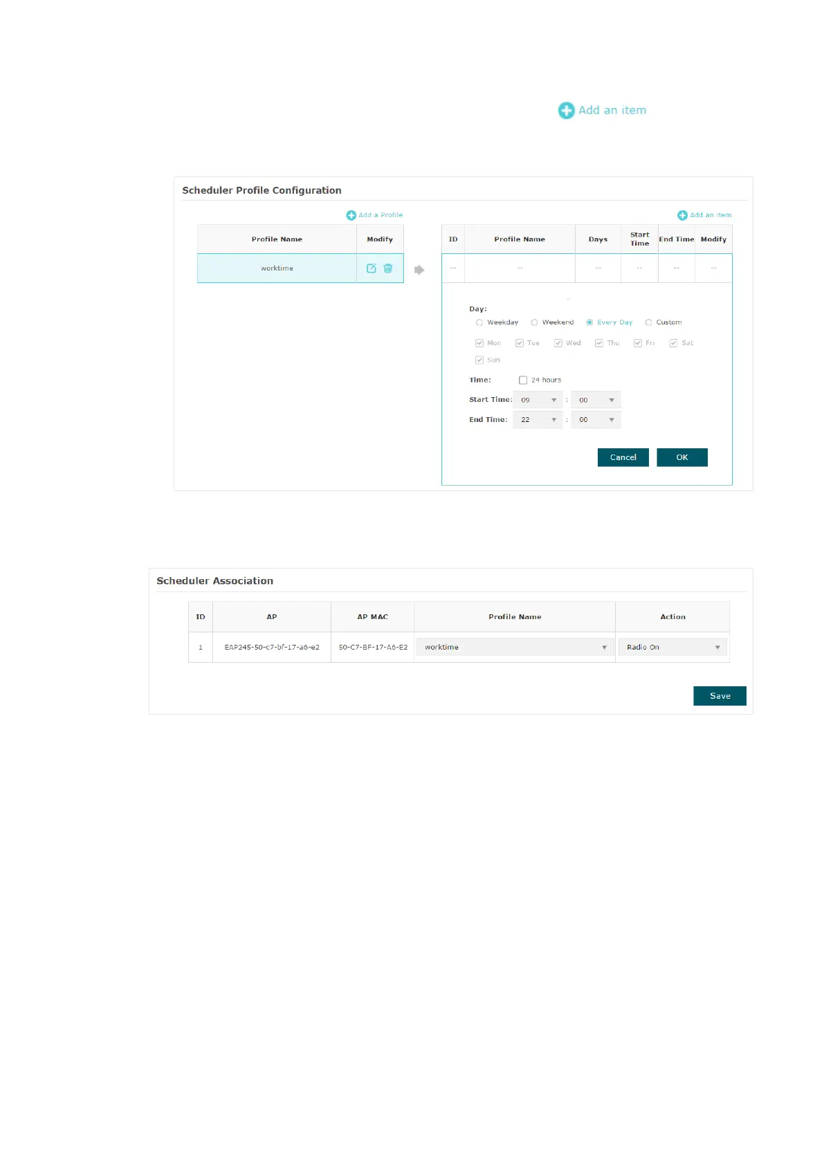 configuraiton page will appear. Specify the time range as everyday 9:00 to 22:00.