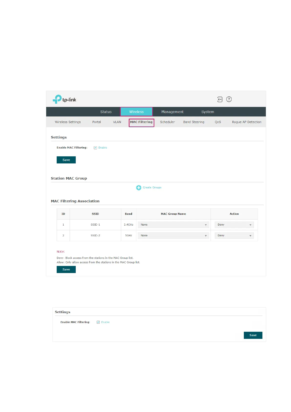 1. In the Settings section, check the box to enable MAC Filtering, and click Save.