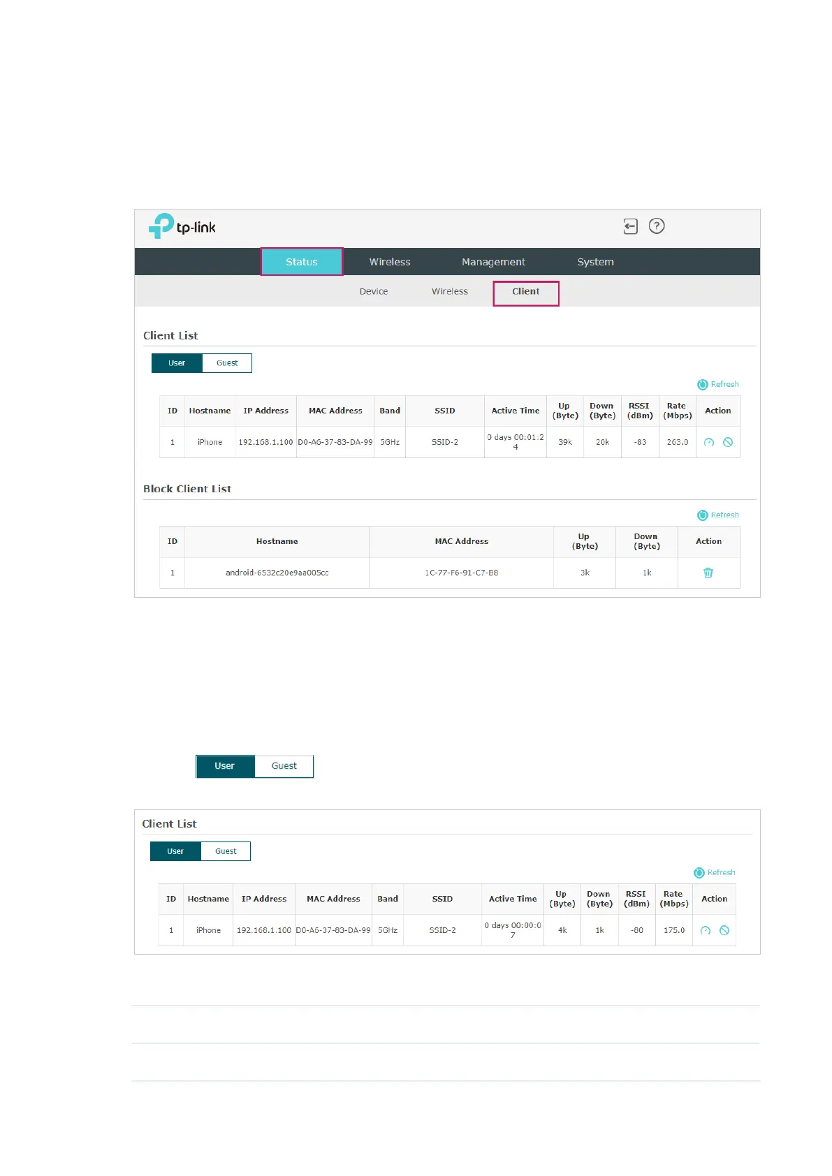 To monitor the client information, go to the Status > Client page.