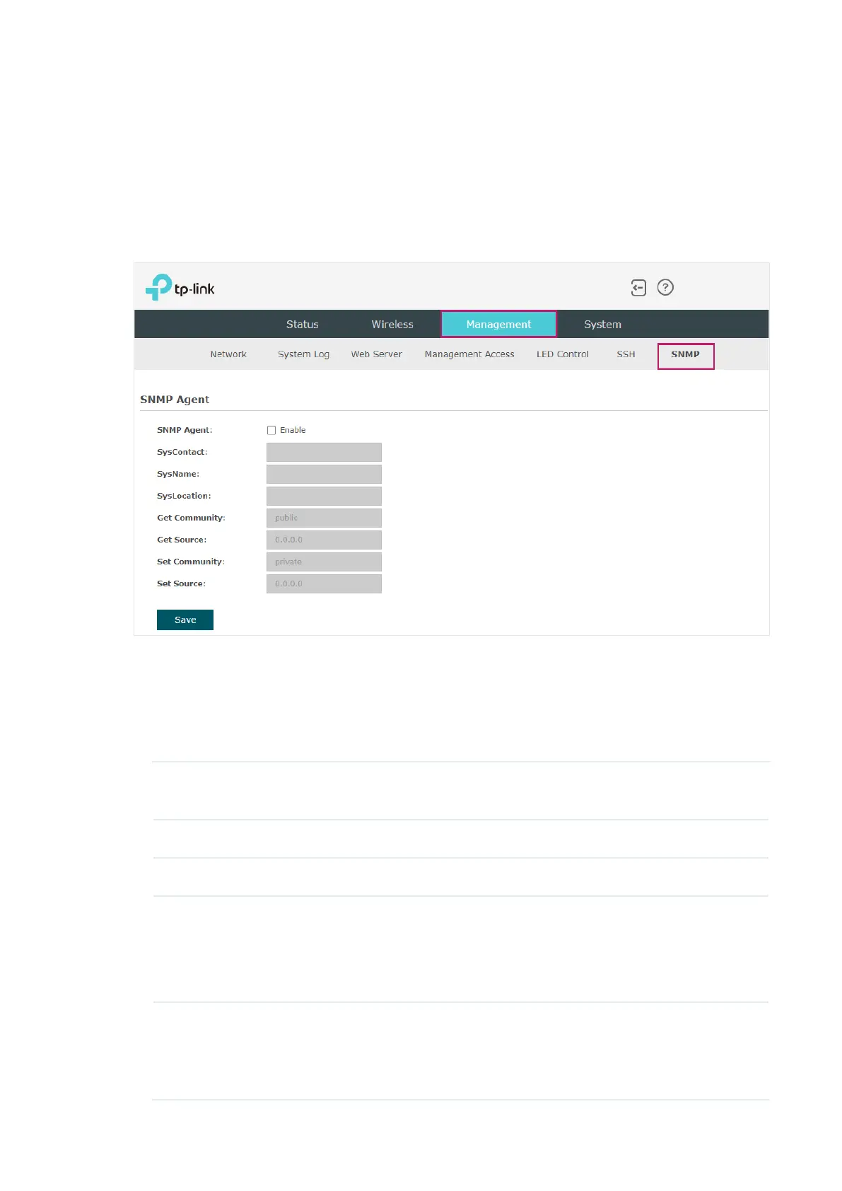 To configure the AP as an SNMP agent, go to the Management > SNMP page.