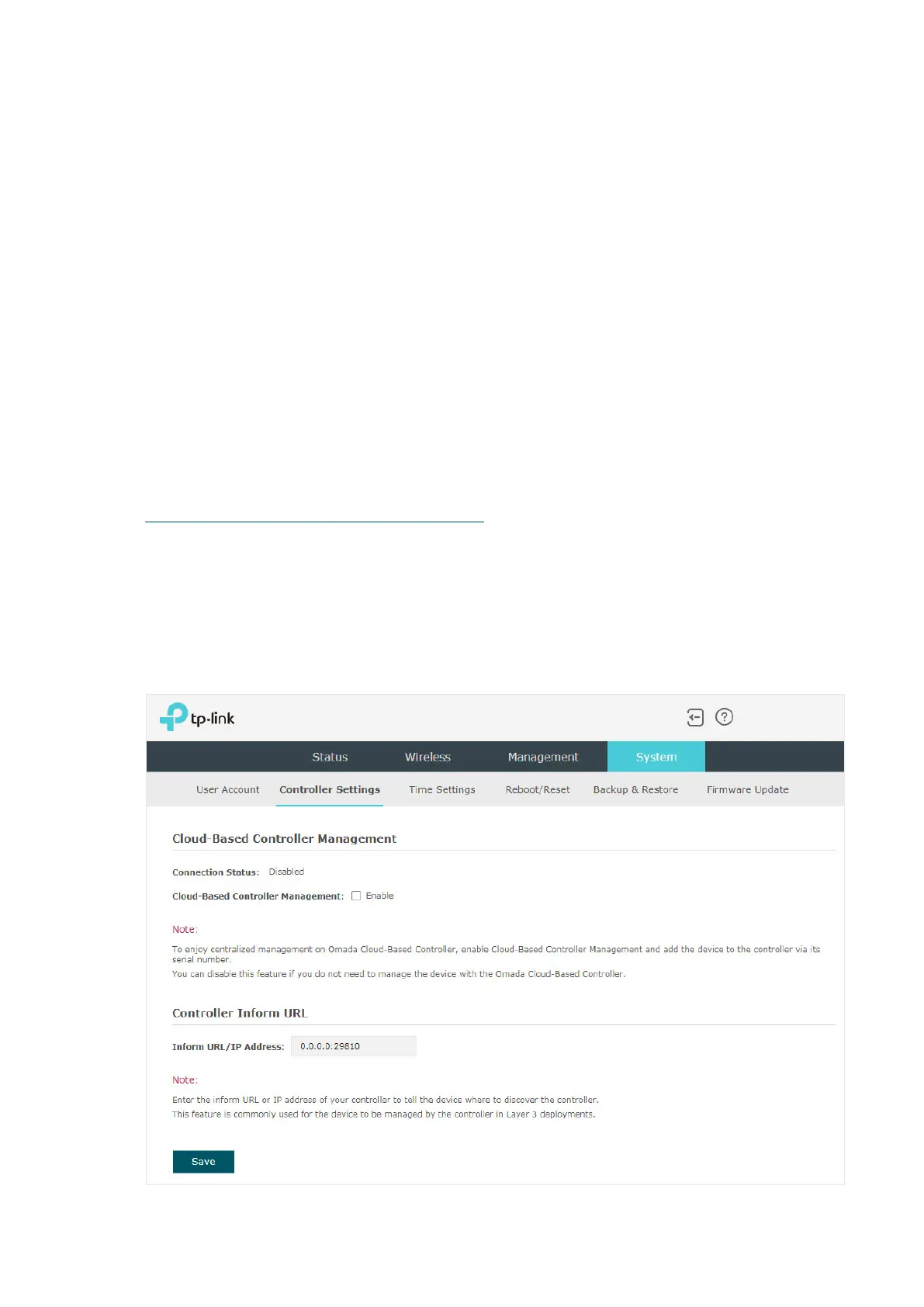 Go to the System > Controller Settings page. In the Cloud- Based Controller Management