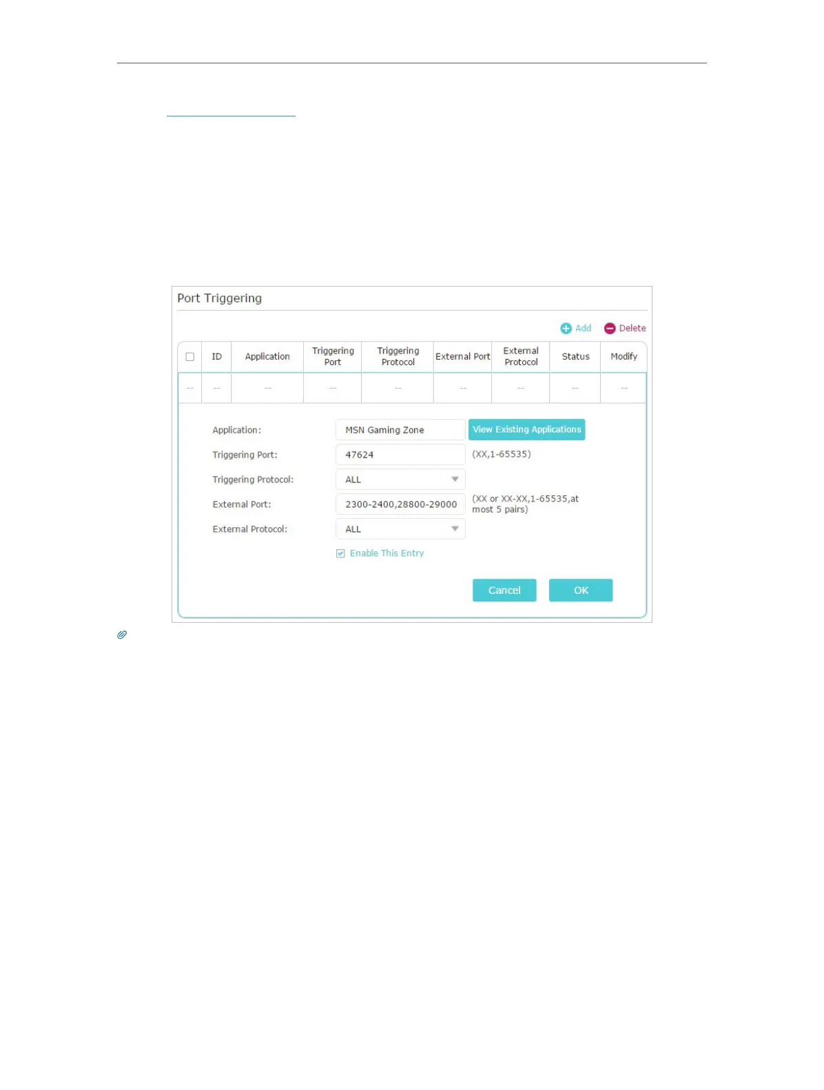 2. Go to Advanced > NAT Forwarding > Port Triggering and click Add.