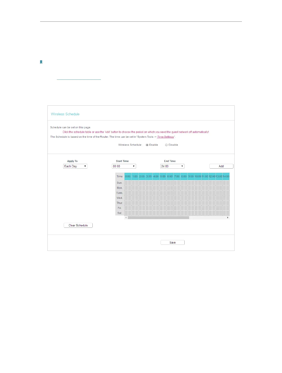 Note: Before configure the Wireless Schedule, please go to System Tools > Time Settings page to set system time