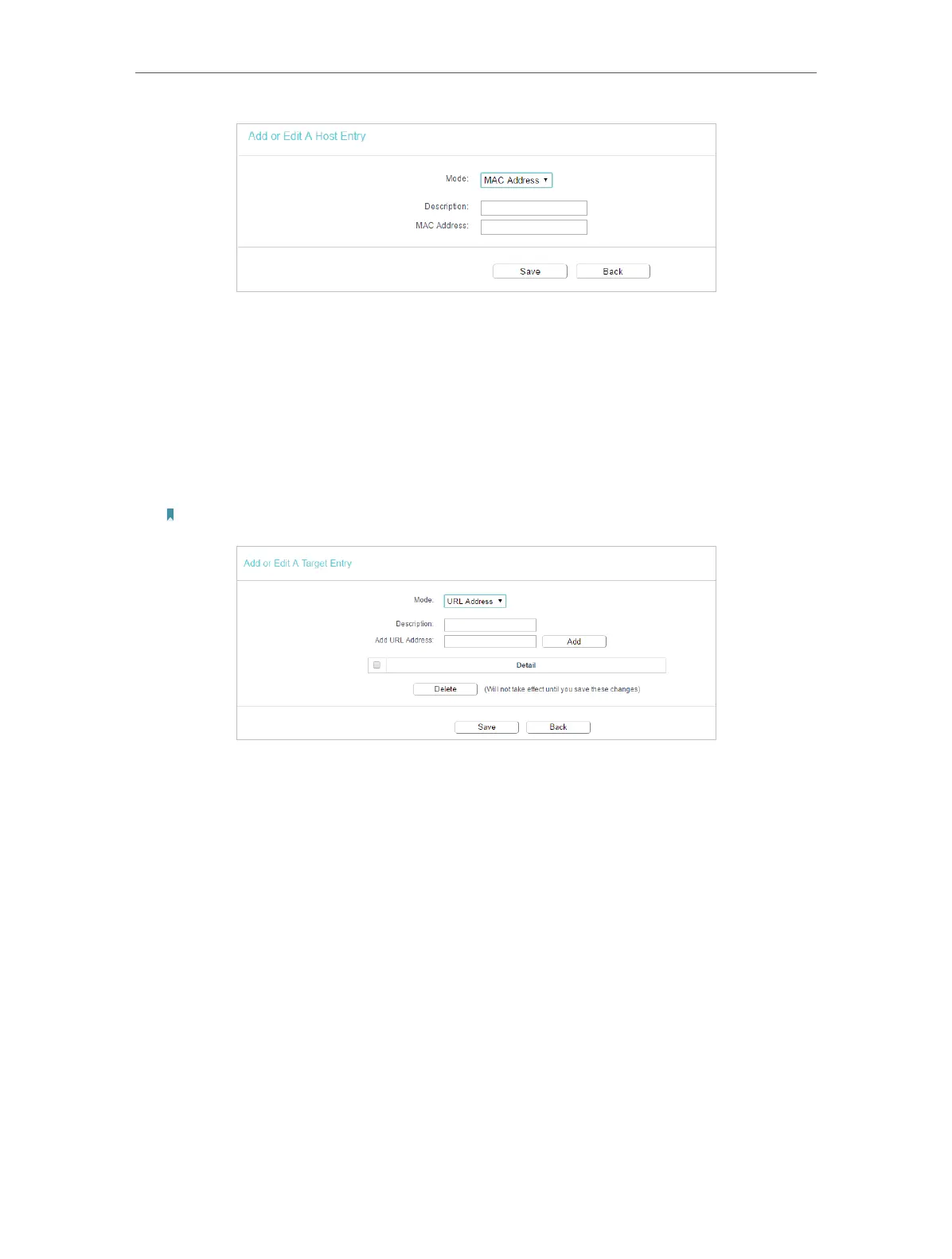 Note: Any URL address with keywords in it (e.g. www.tp-link.com) will be blocked or allowed.