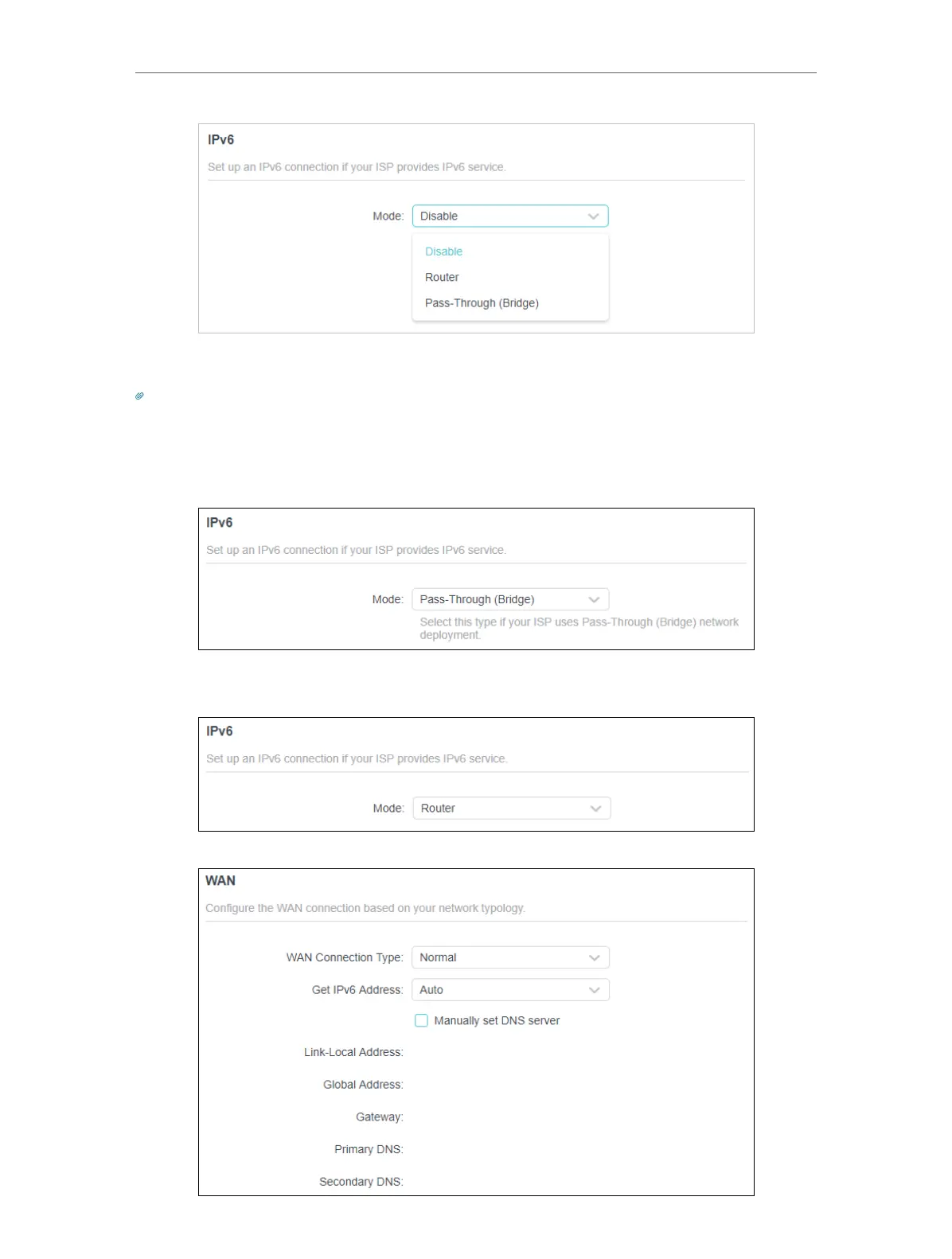 3. Select the mode provided by your ISP to enable IPv6 connection.