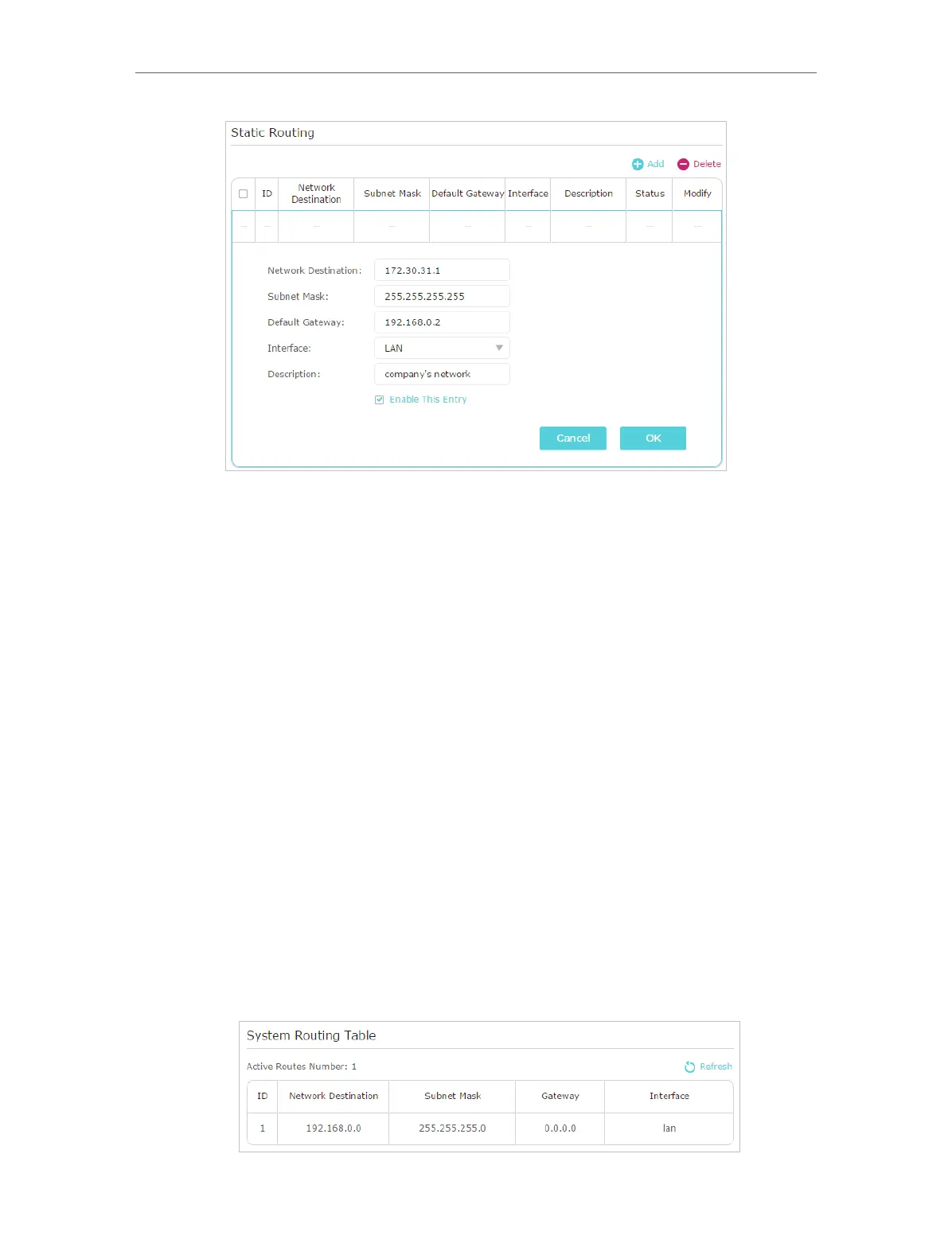 6. Check the System Routing Table below. If you can find the entry you’ve set, the