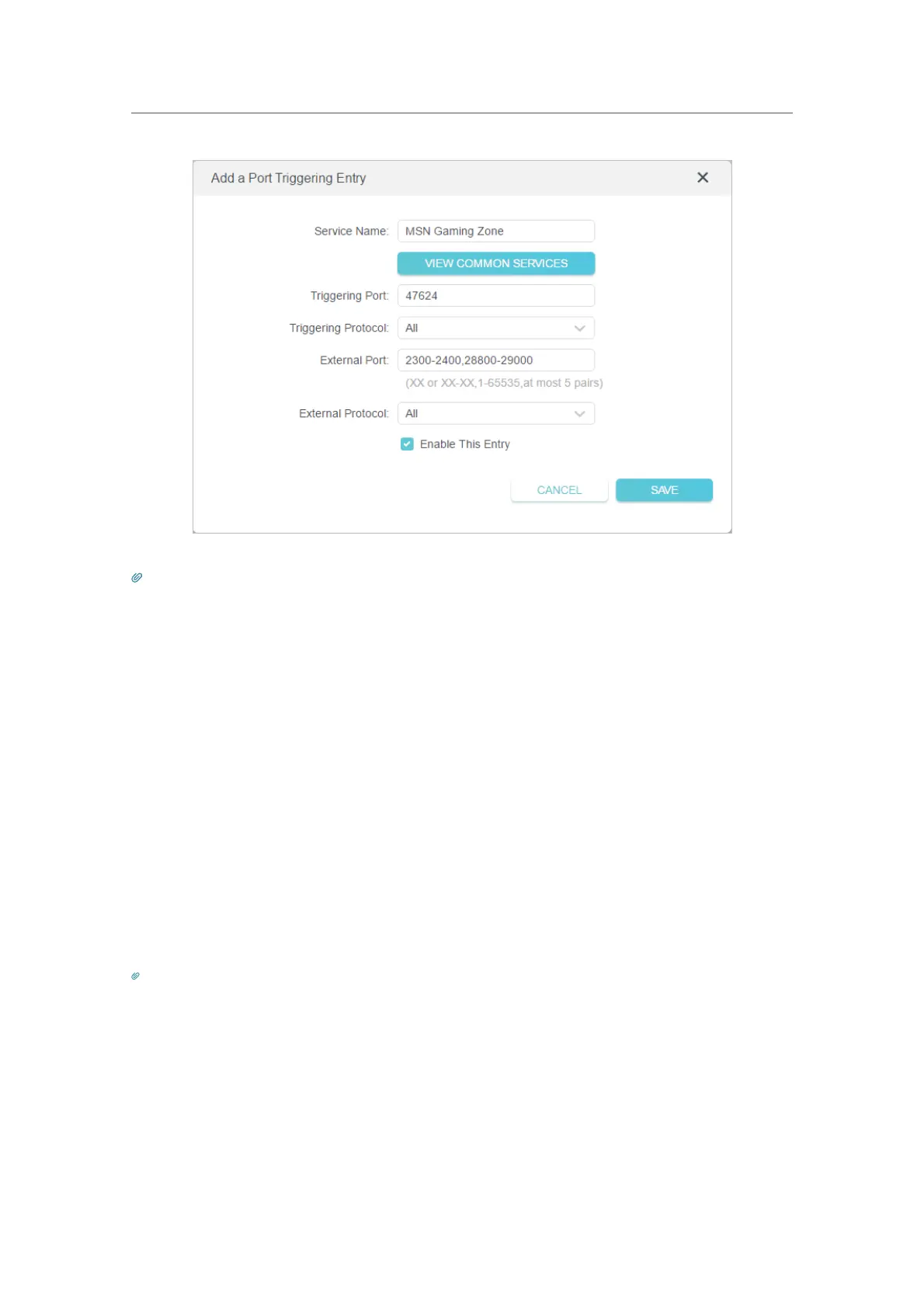 • You can add multiple port triggering rules according to your network need.