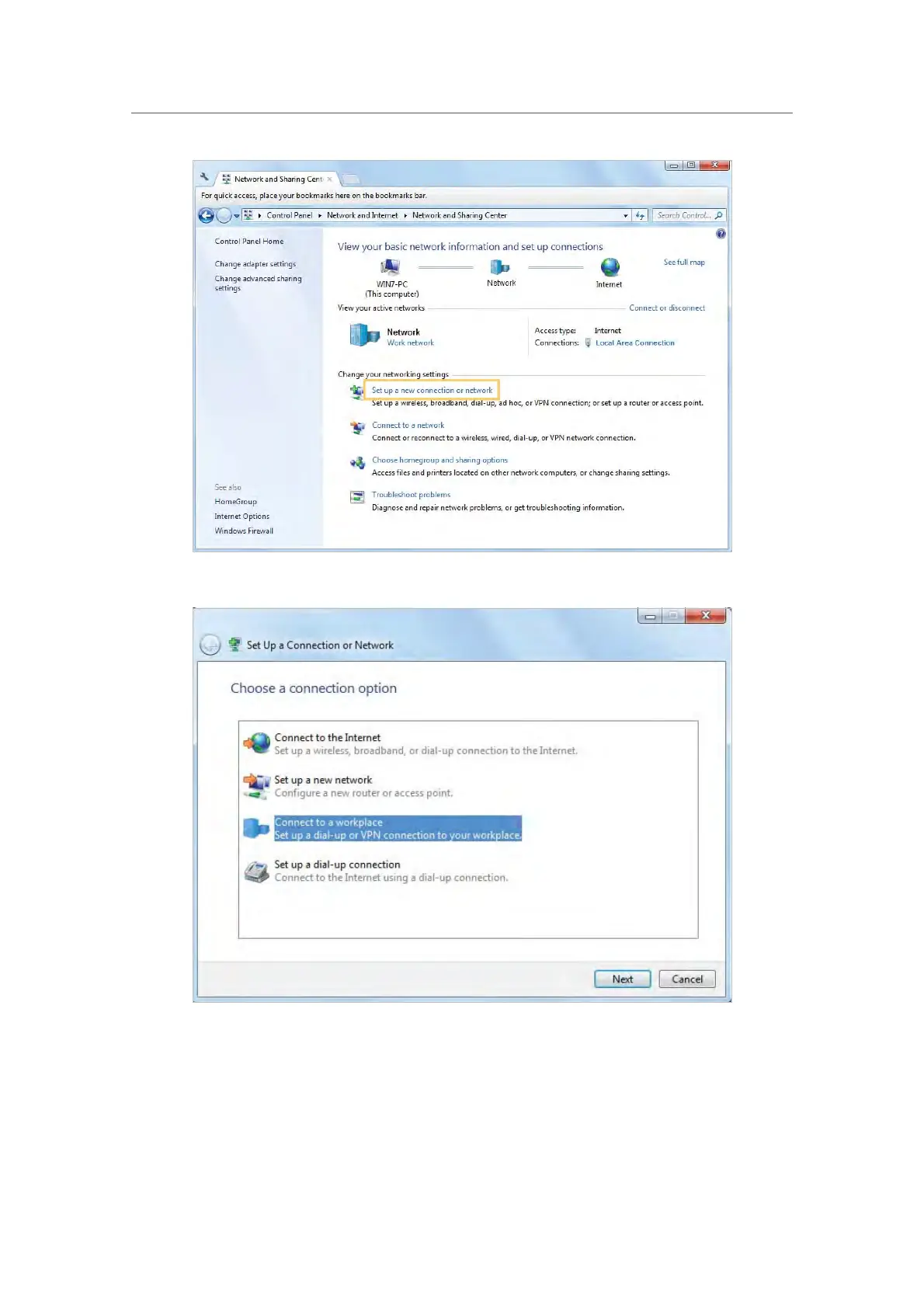 3. Select Connect to a workplace and click Next.