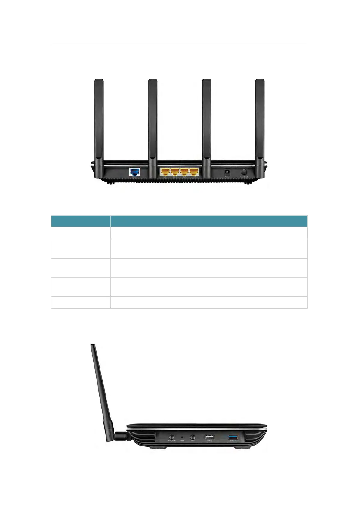 The router’s back panel shows the connection ports, buttons and antennas (view from