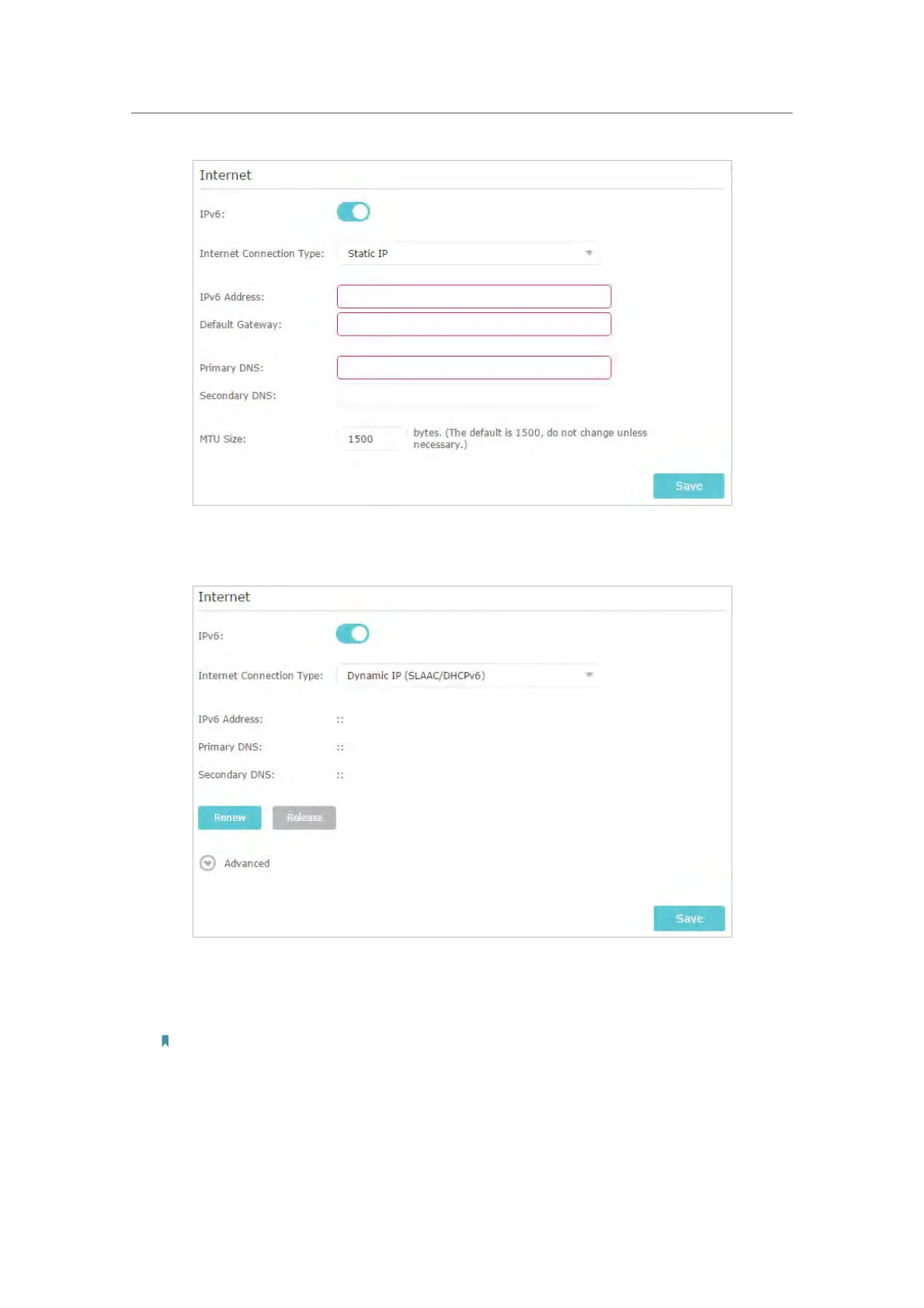 2 ) Dynamic IP (SLAAC/DHCPv6): Click Advanced to input further information if