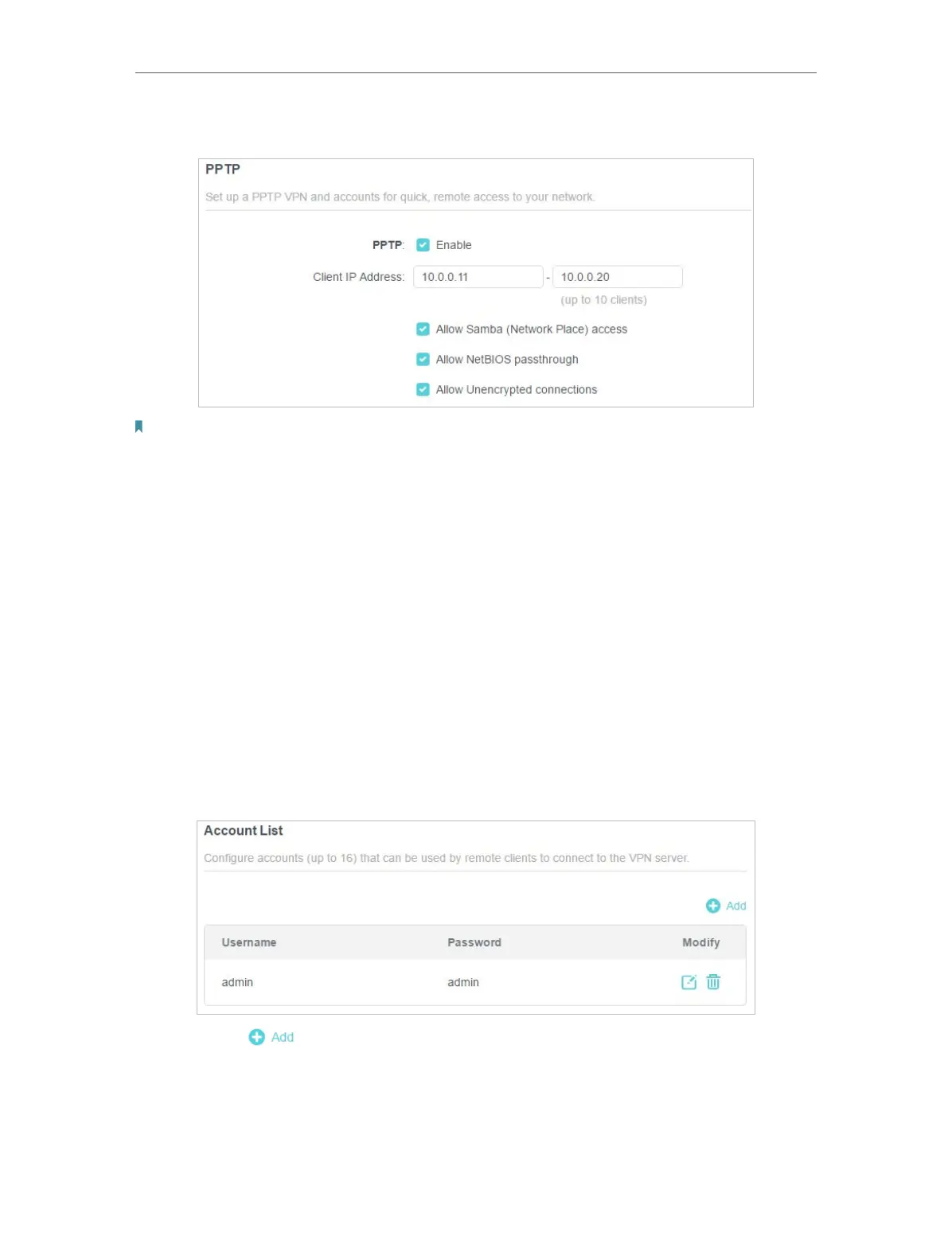 6. Configure the PPTP VPN connection account for the remote device. You can create