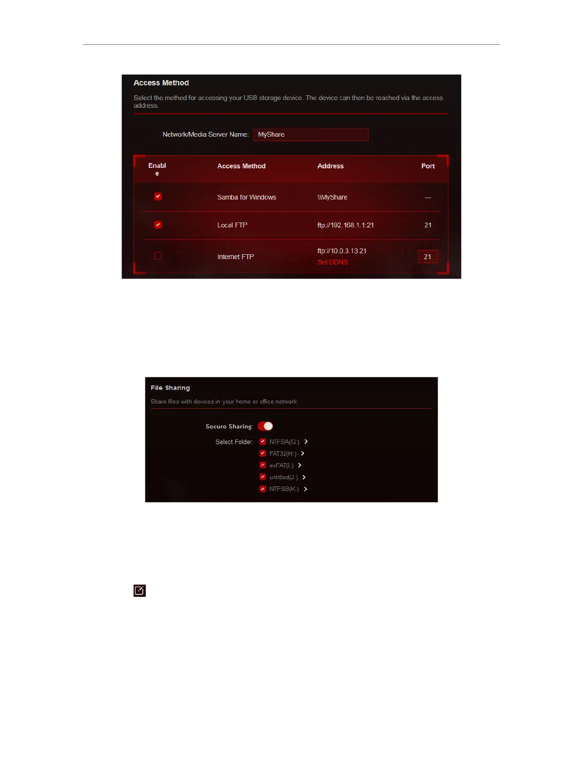 In the File Sharing section, enable Secure Sharing. The default accounts are admin and