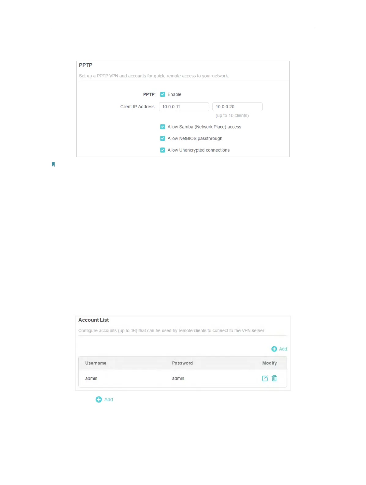 6. Configure the PPTP VPN connection account for the remote device. You can create