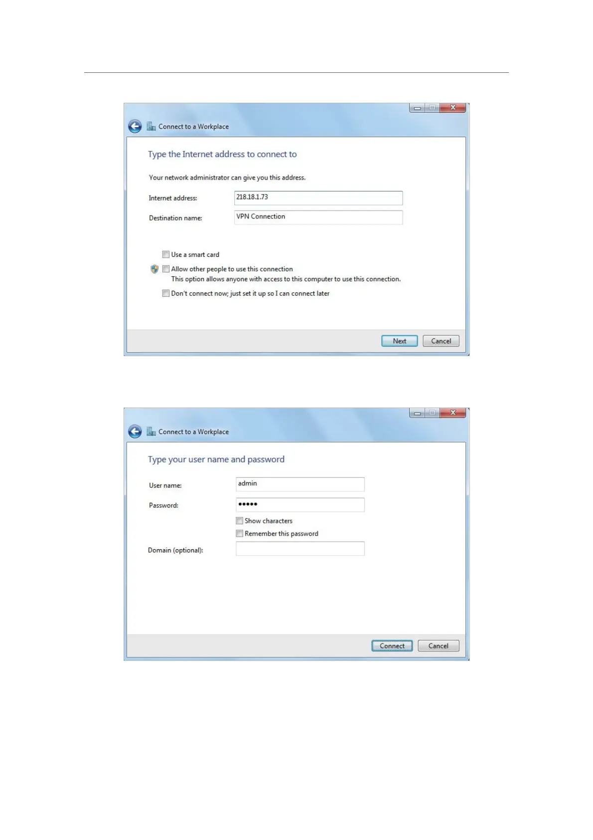 6. Enter the User name and Password you have set for the PPTP VPN server on your