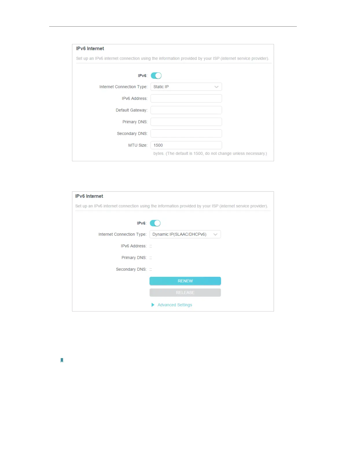 2 ) Dynamic IP(SLAAC/DHCPv6): Click Advanced to input further information if