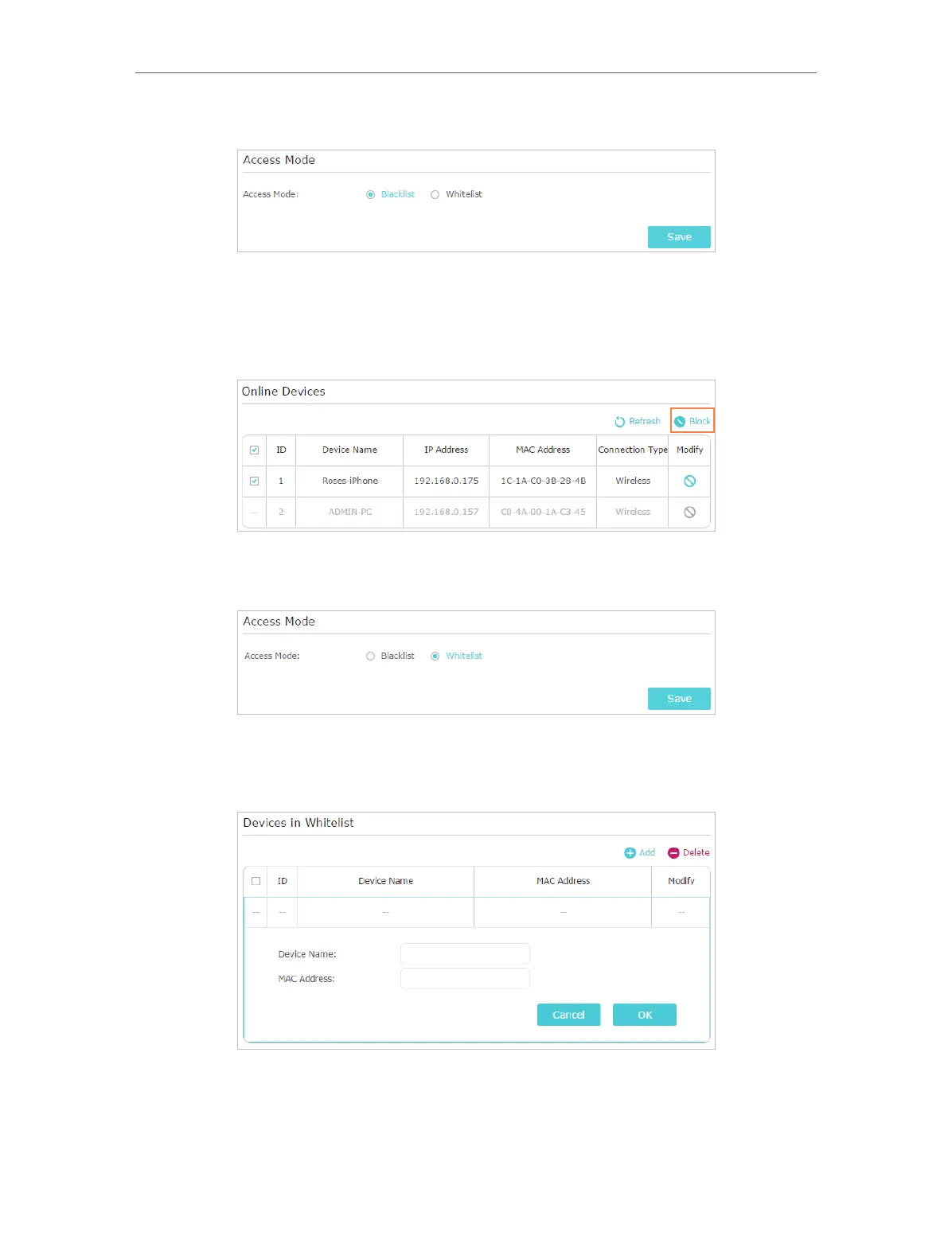 2 ) Click Add in the Devices in Whitelist section. Enter the Device Name and MAC