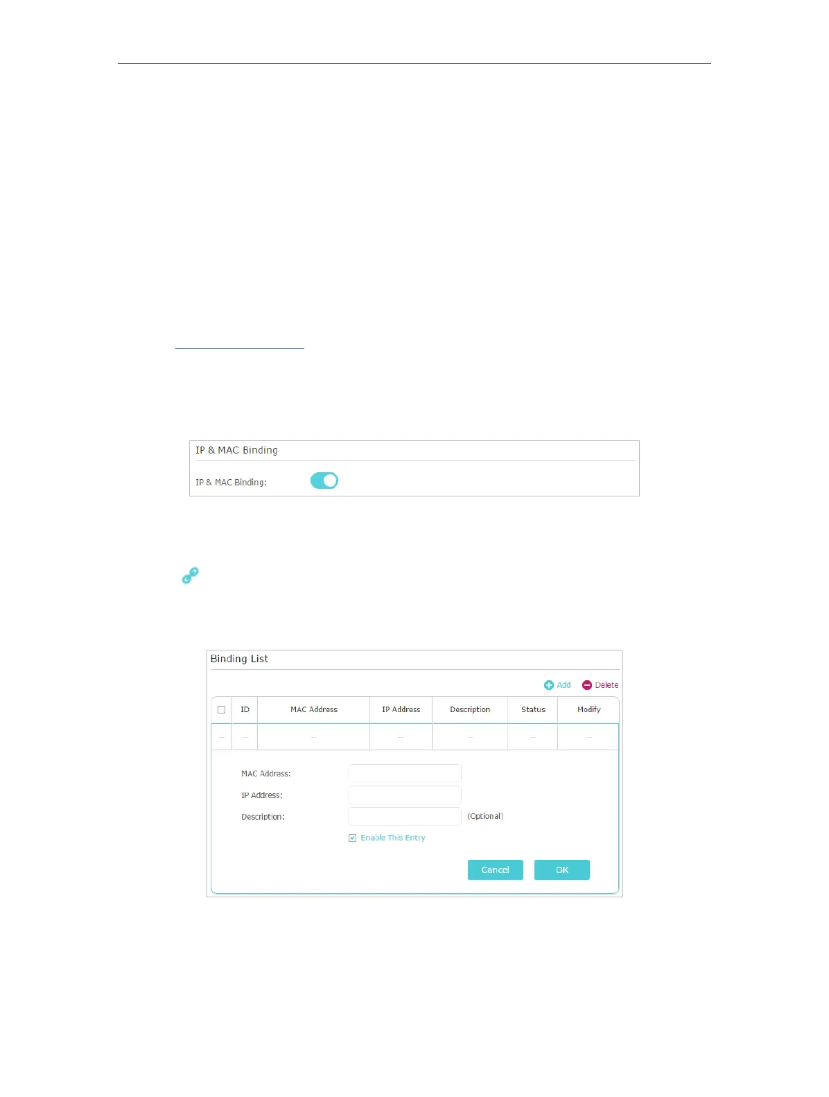 2 ) Enter the MAC address and IP address that you want to bind. Enter a Description