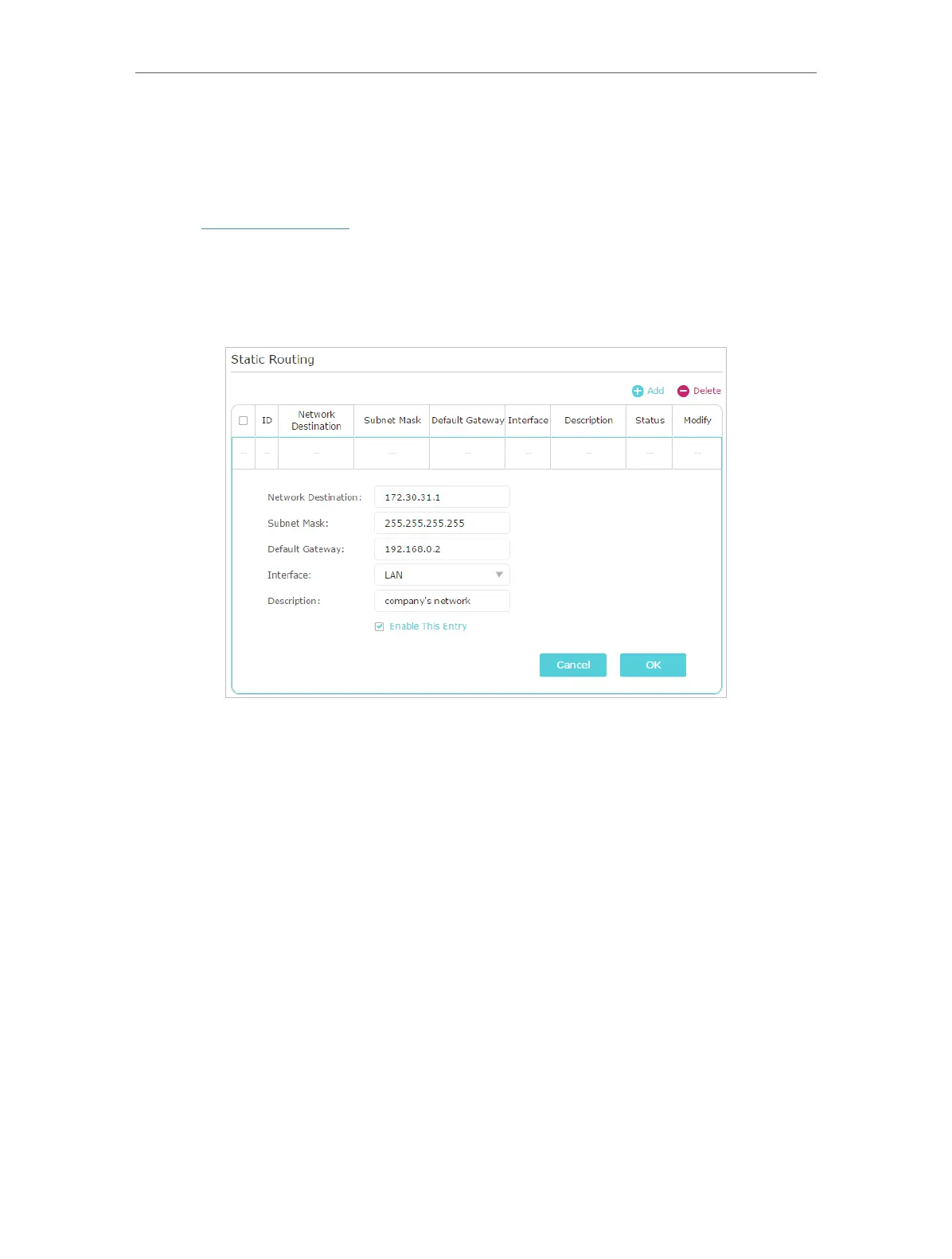 • Description: Enter a description for this static routing entry.