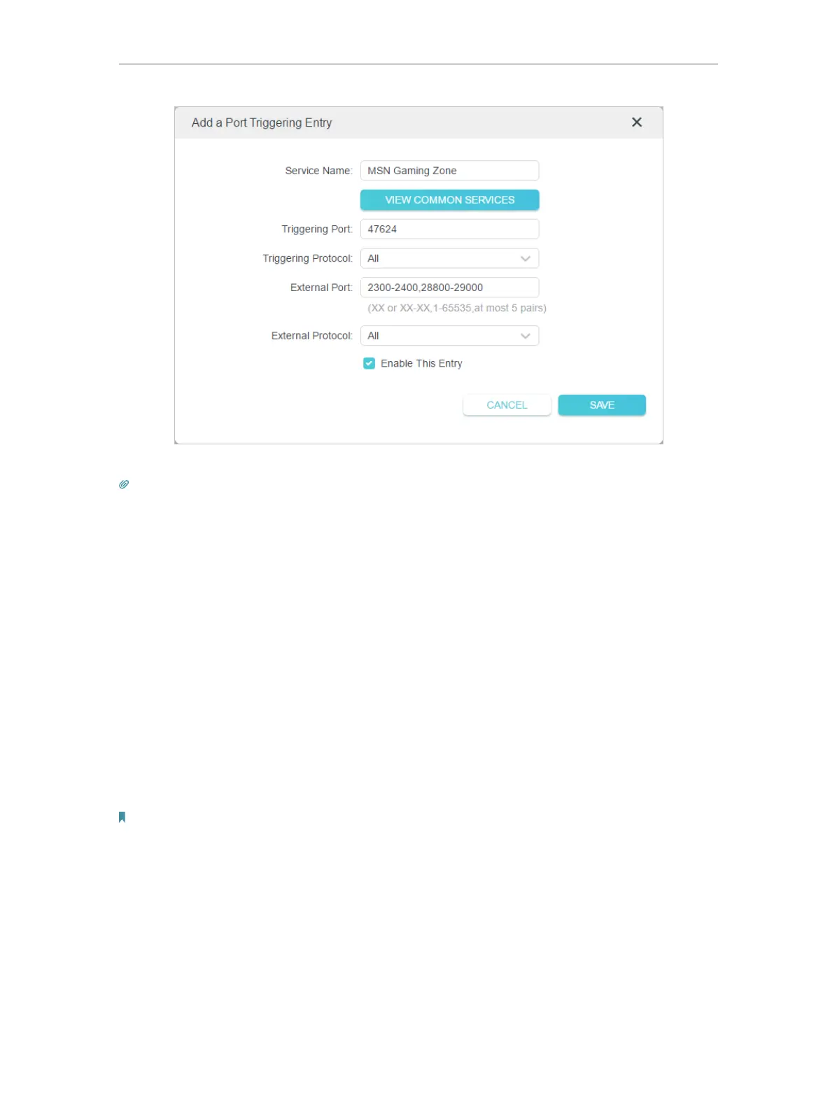 • You can add multiple port triggering rules according to your network need.