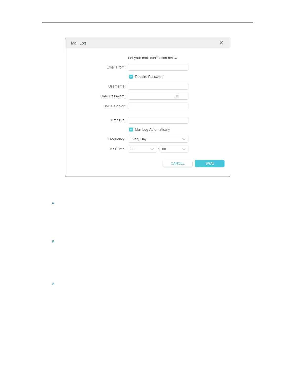 Tips: The router will send the system log to the designated email address if this option is enabled.