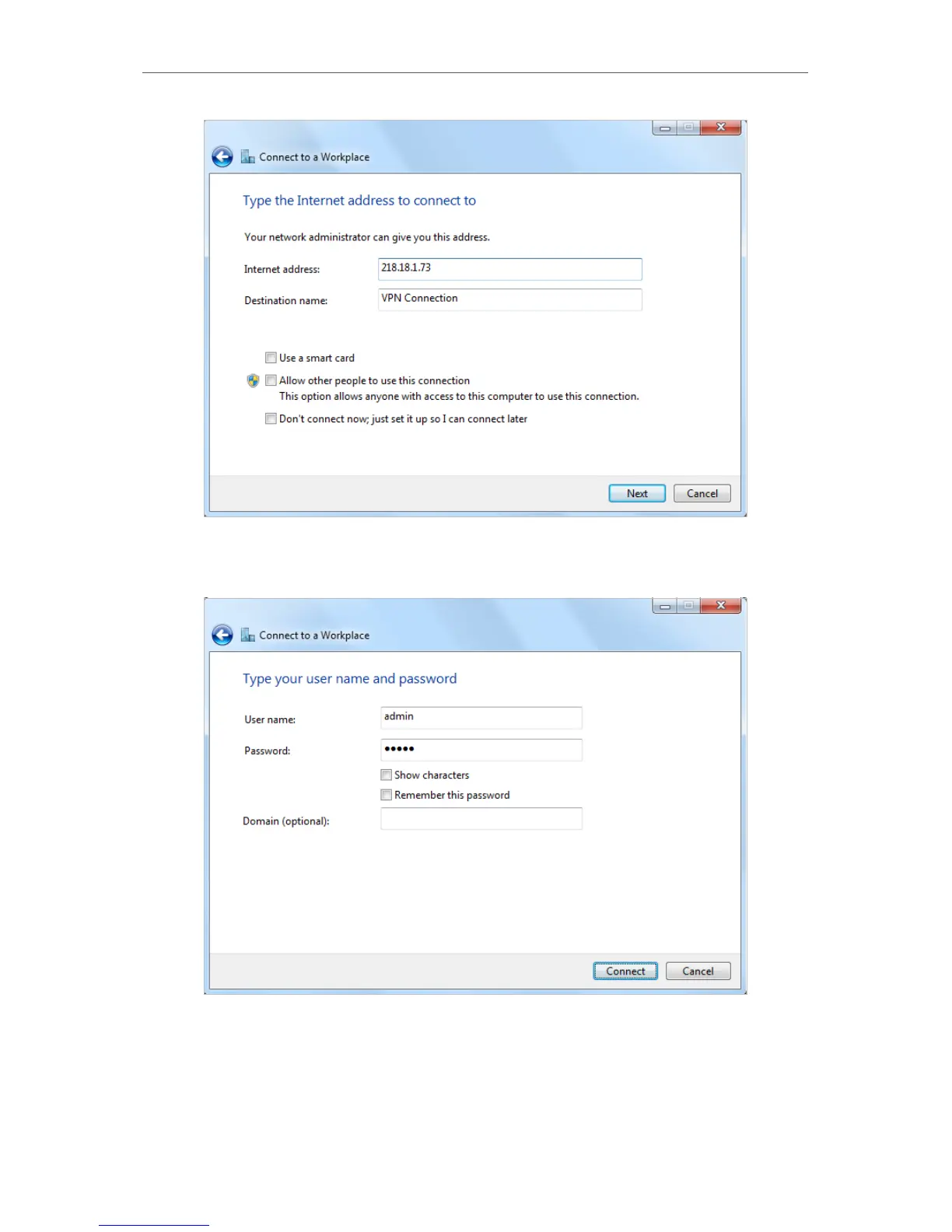 6. Enter the User name and Password you have set for the PPTP VPN server on your