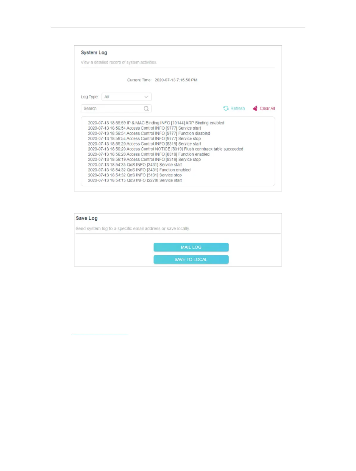 4. In the Save Log section, click SAVE TO LOCAL to save the system logs to a local disk.