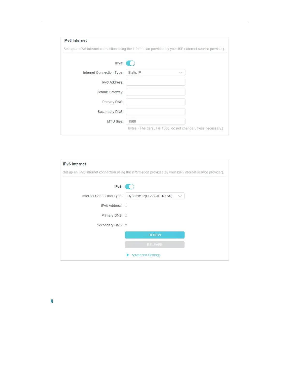2 ) Dynamic IP(SLAAC/DHCPv6): Click Advanced to input further information if