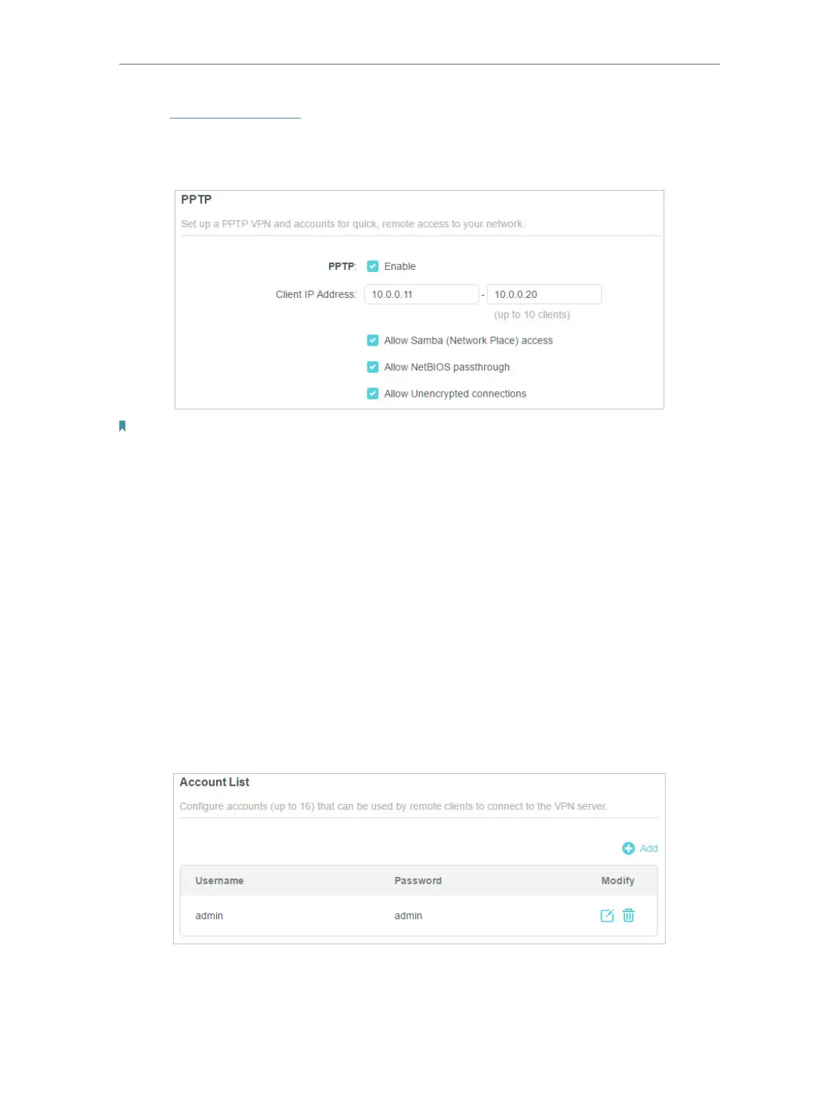 6. Configure the PPTP VPN connection account for the remote device. You can create