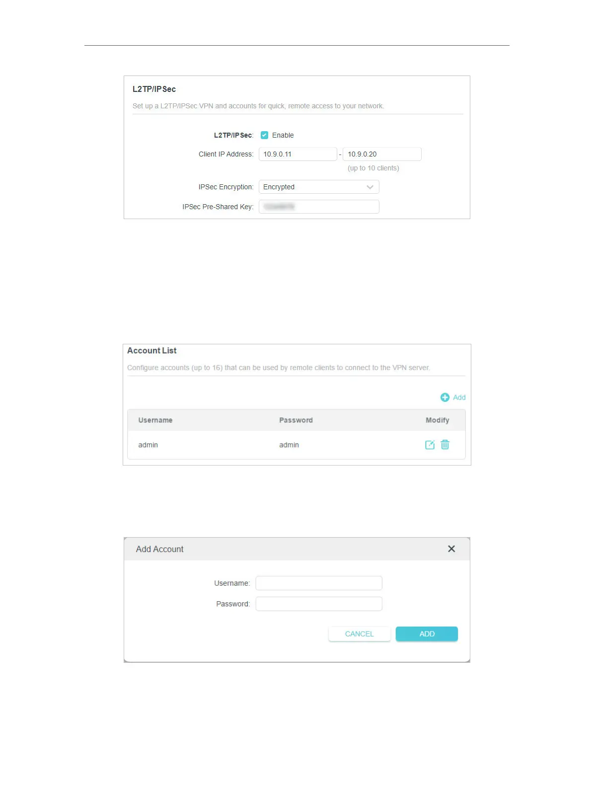 6. Configure the L2TP/IPSec VPN connection account for the remote device. You can