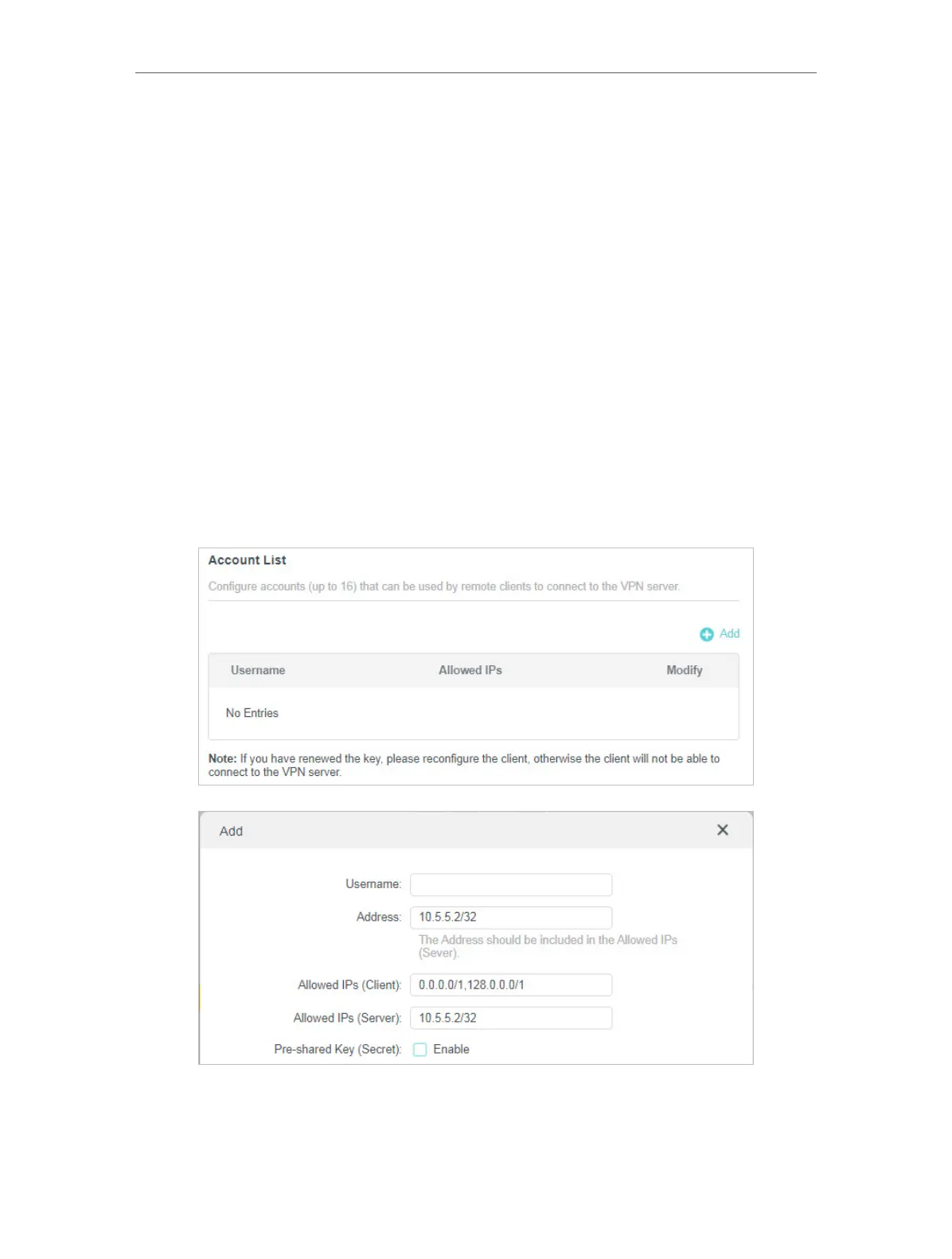1. Locate the Account List section. Click Add to create an account.