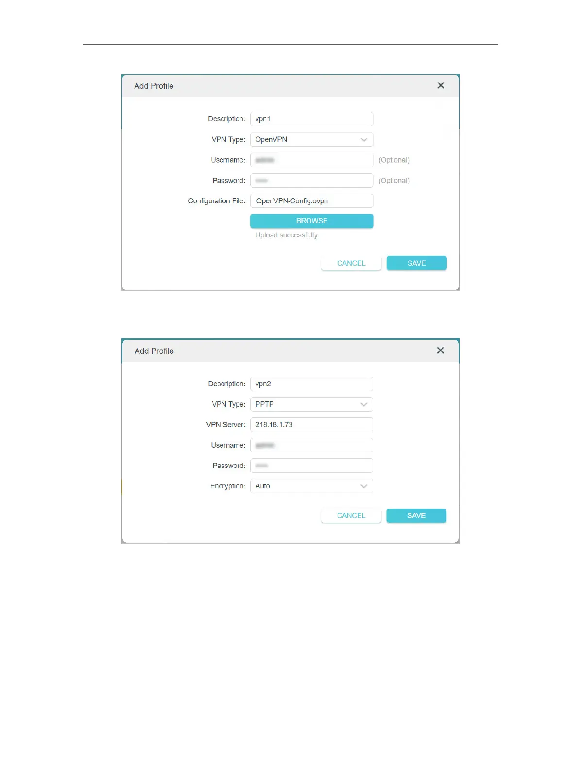 PPTP: Enter the VPN server address (for example: 218.18.1.73) and the VPN