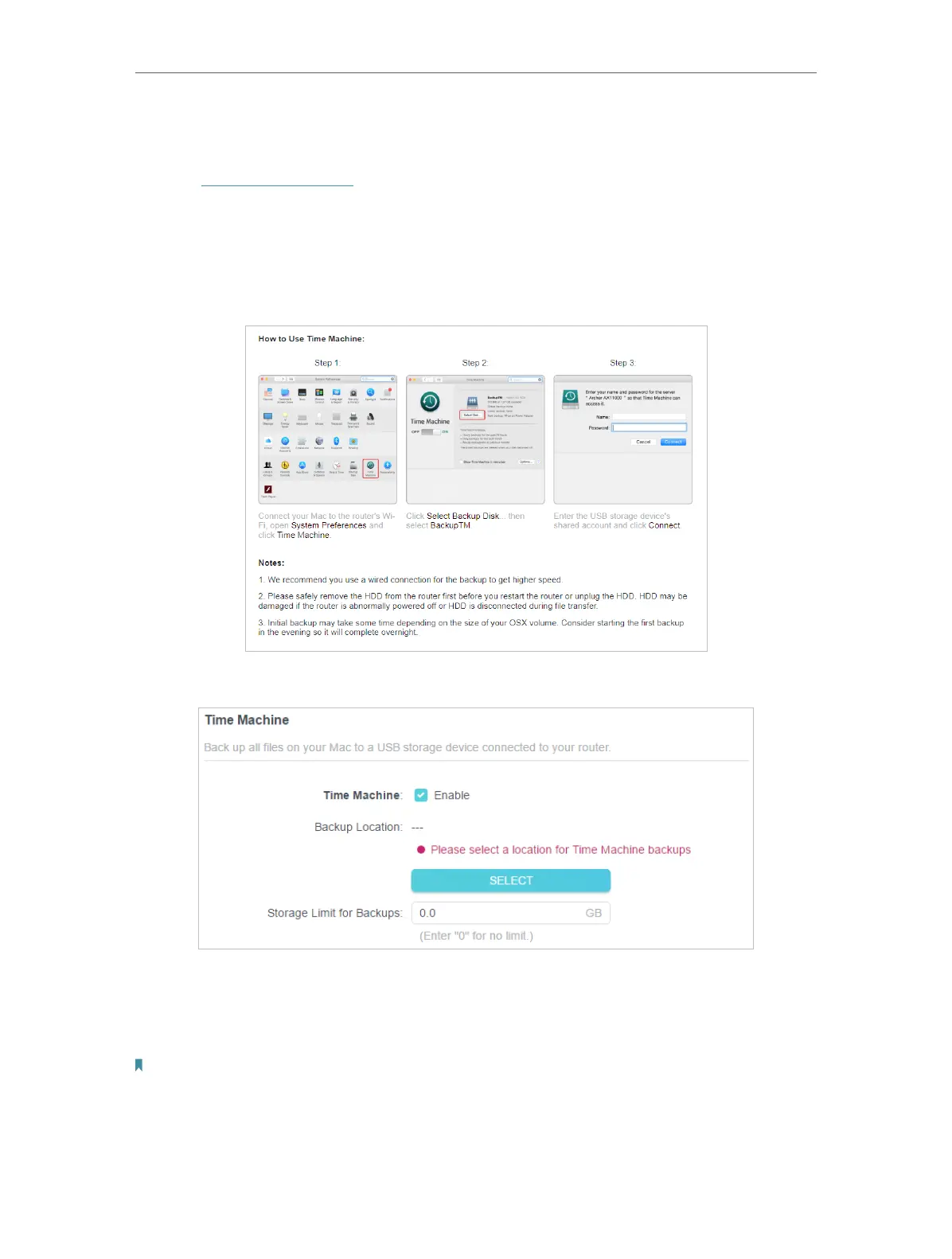 2. Click SELECT to select a location for Time Machine backups.