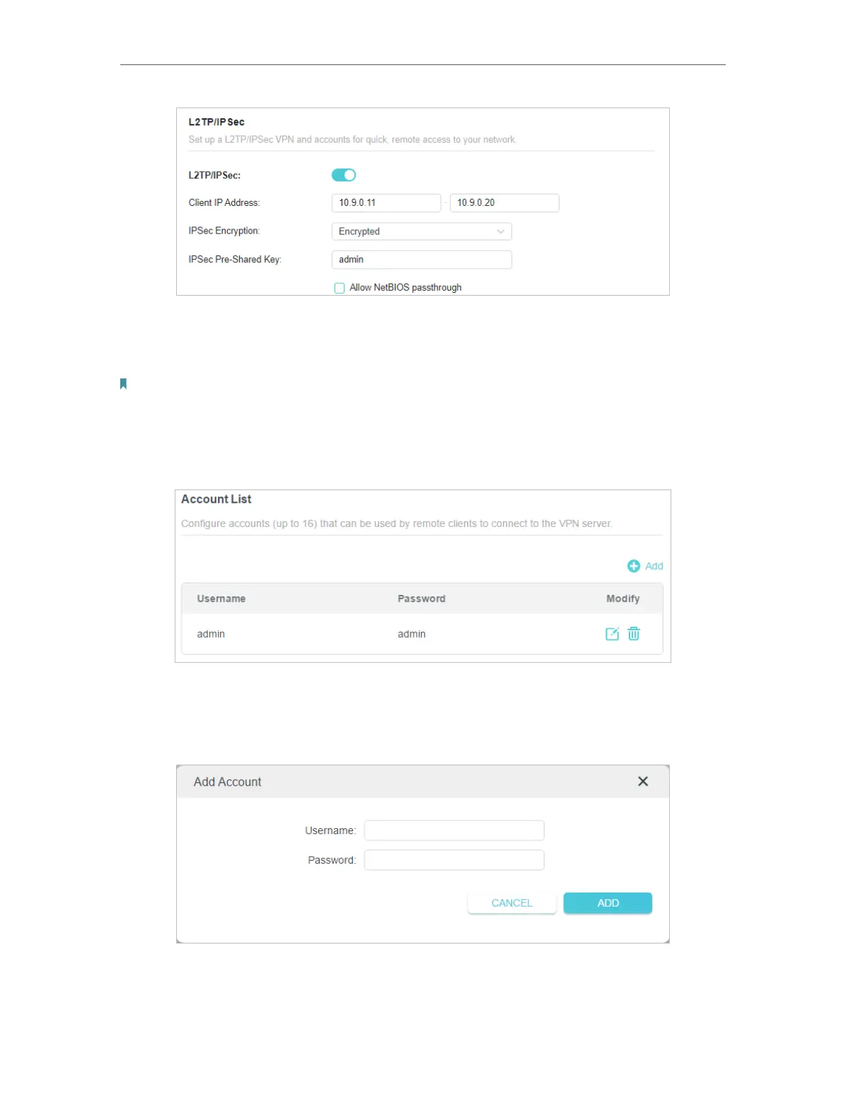 6. Configure the L2TP/IPSec VPN connection account for the remote device. You can