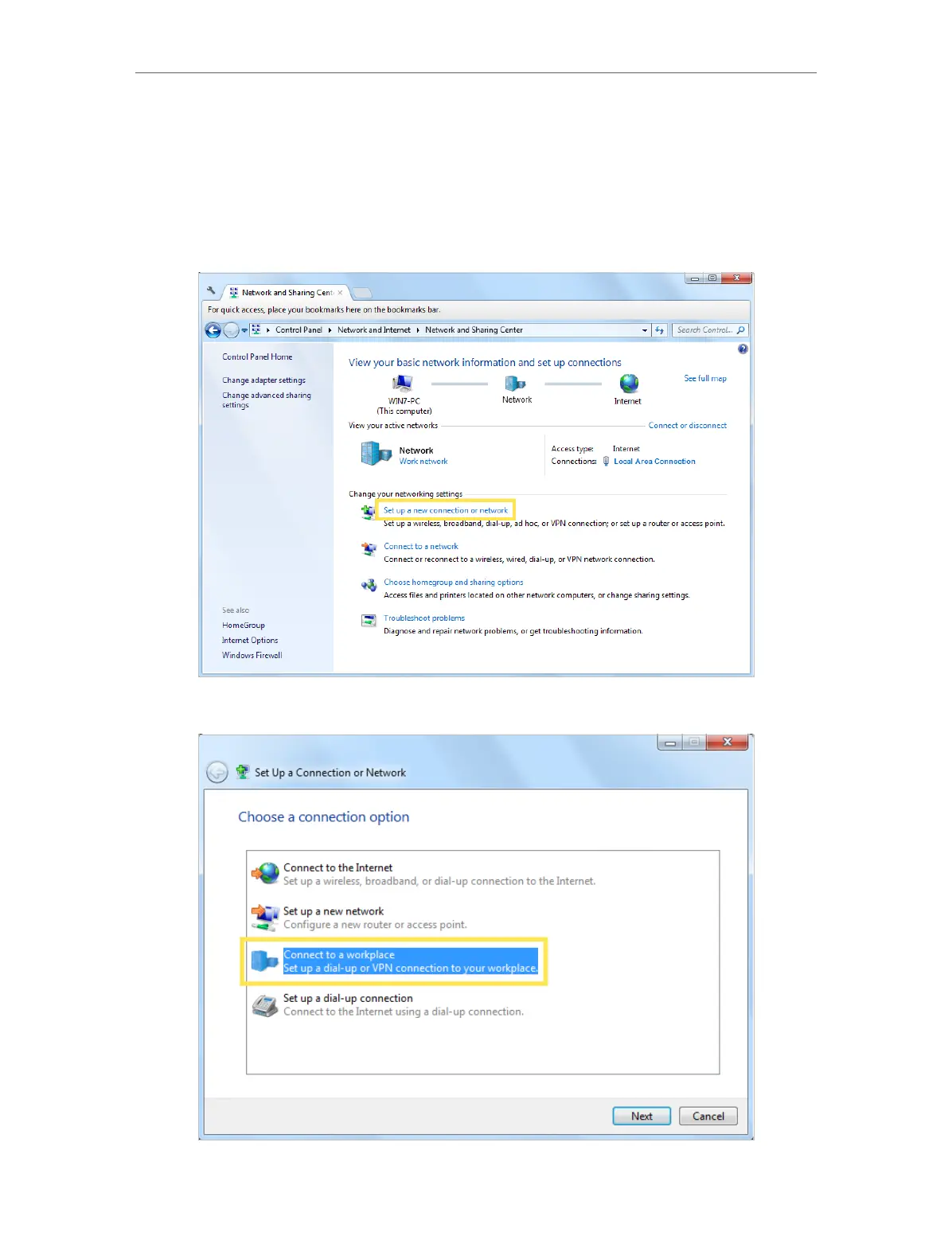 3. Select Connect to a workplace and click Next.