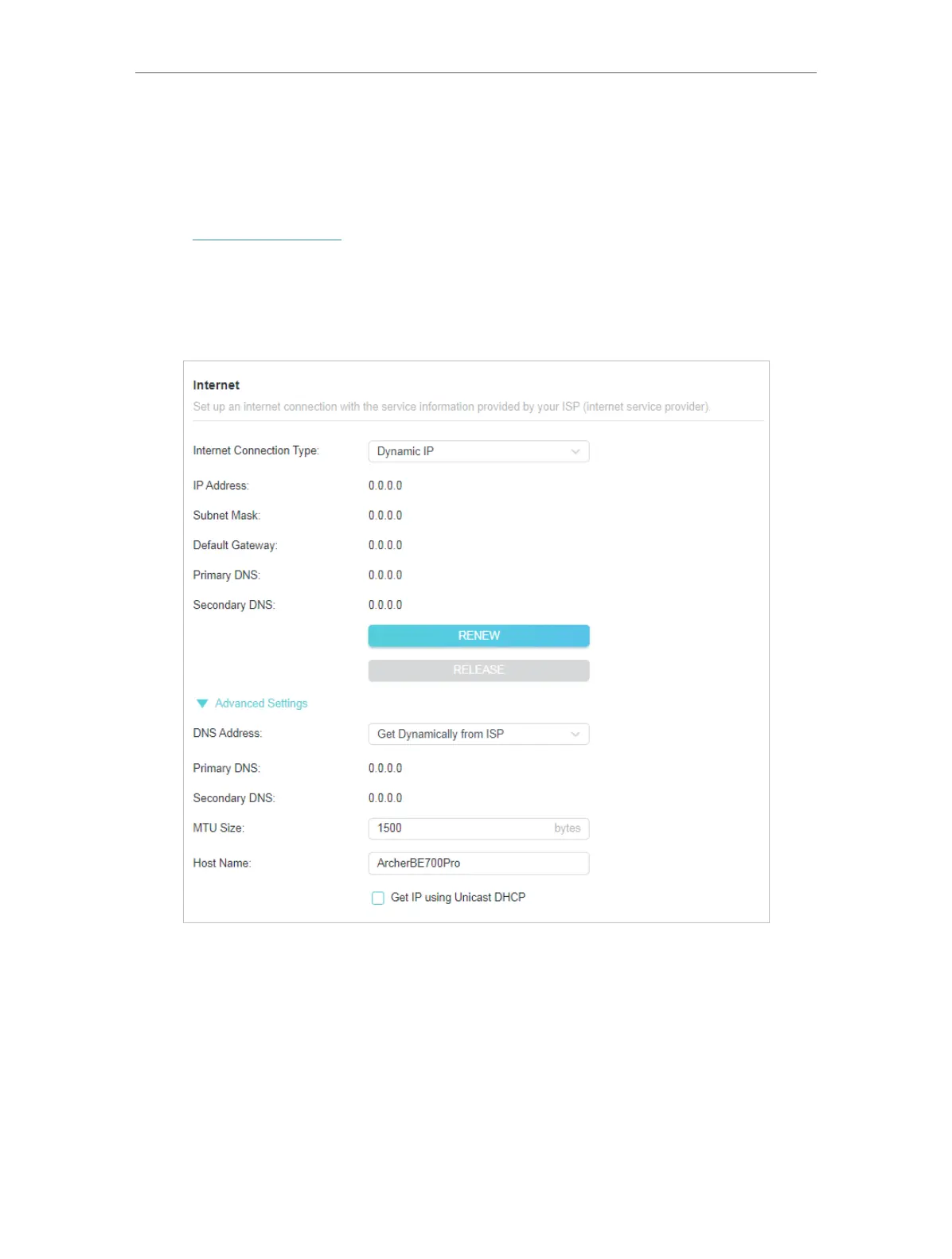 1. Select the internet connection type and configure the settings according to the