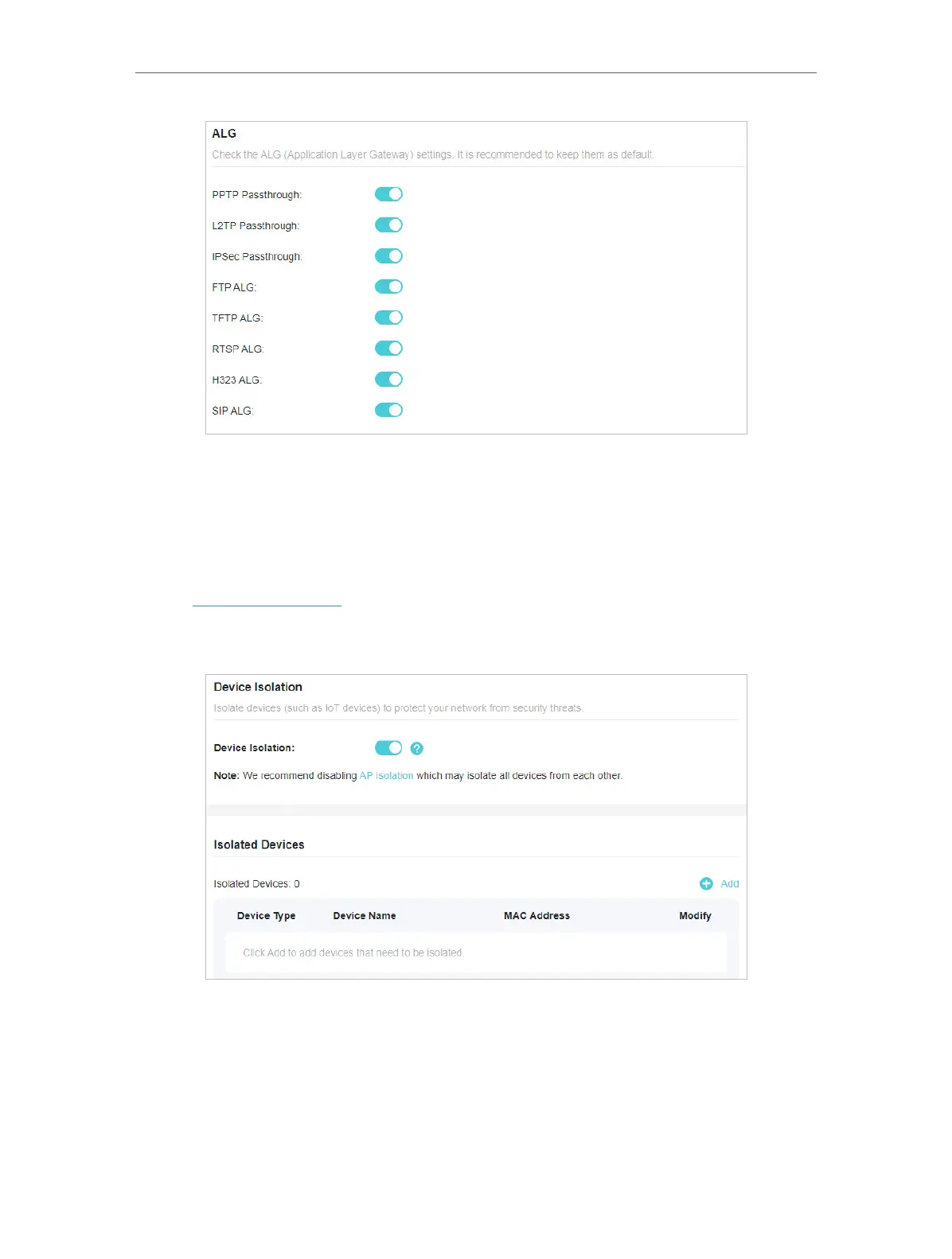 2. Go to Advanced > Security > Device Isolation. Enable Device Isolation.