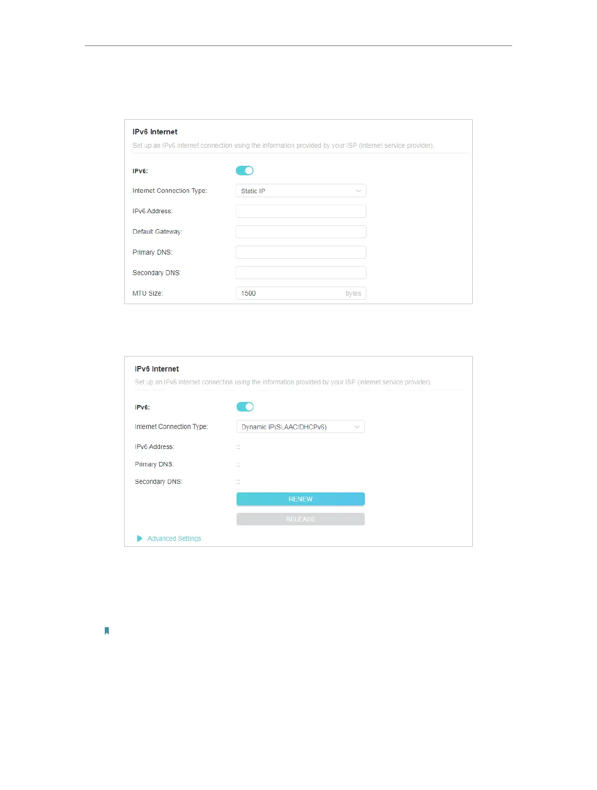 2 ) Dynamic IP(SLAAC/DHCPv6): Click Advanced to input further information if