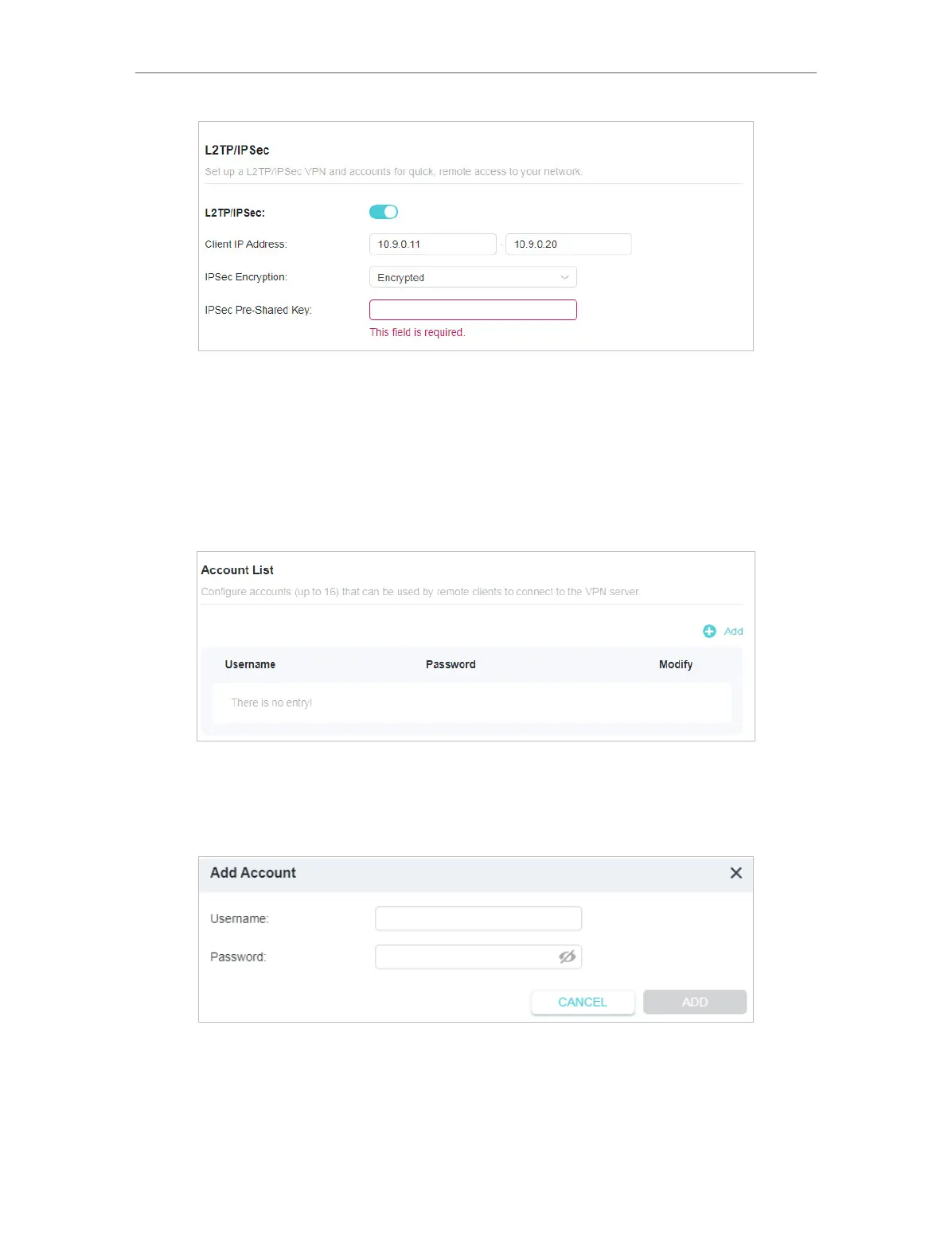 6. Configure the L2TP/IPSec VPN connection account for the remote device. You can