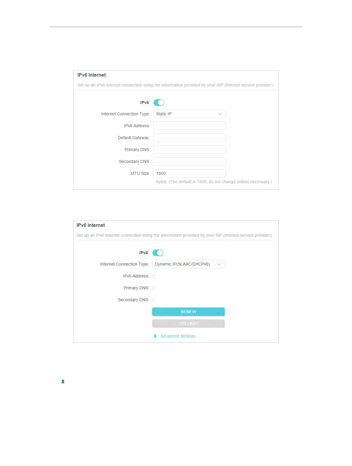 2 ) Dynamic IP(SLAAC/DHCPv6): Click Advanced to input further information if