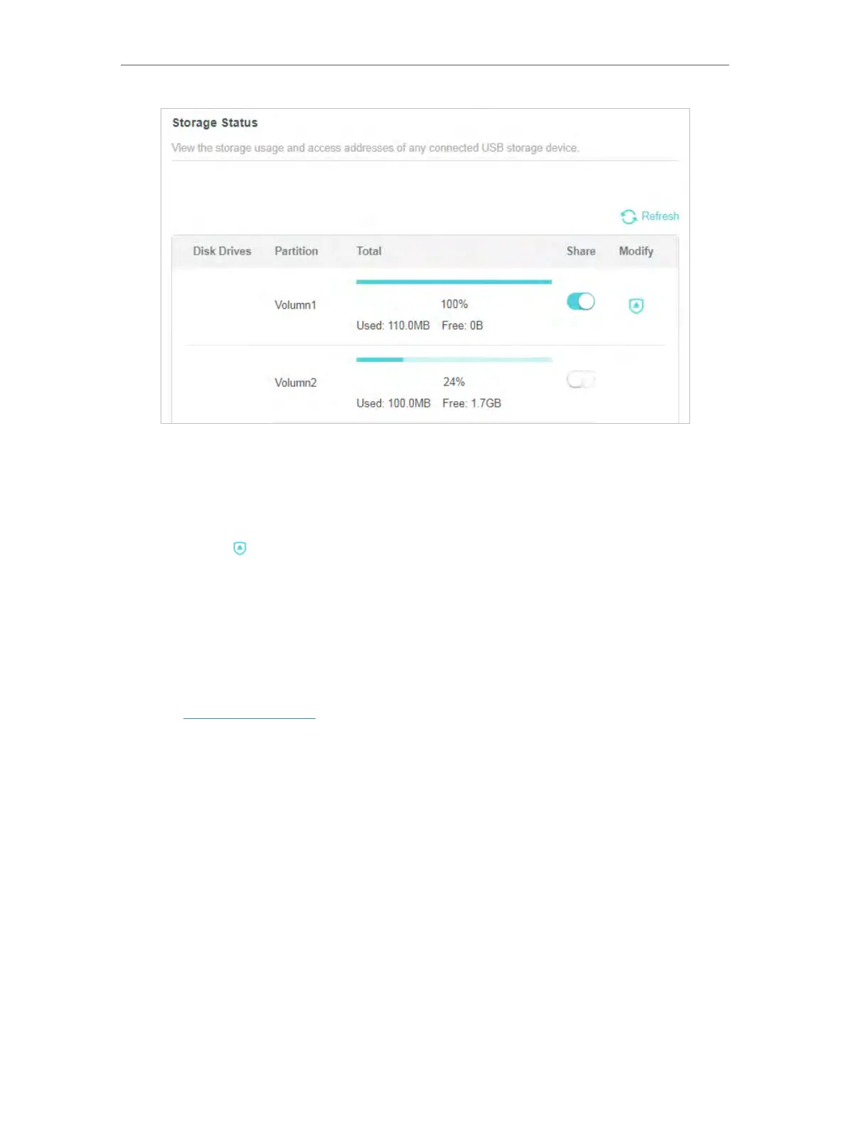 • Disk Drives: Displays the USB storage device(s) connected to the router.