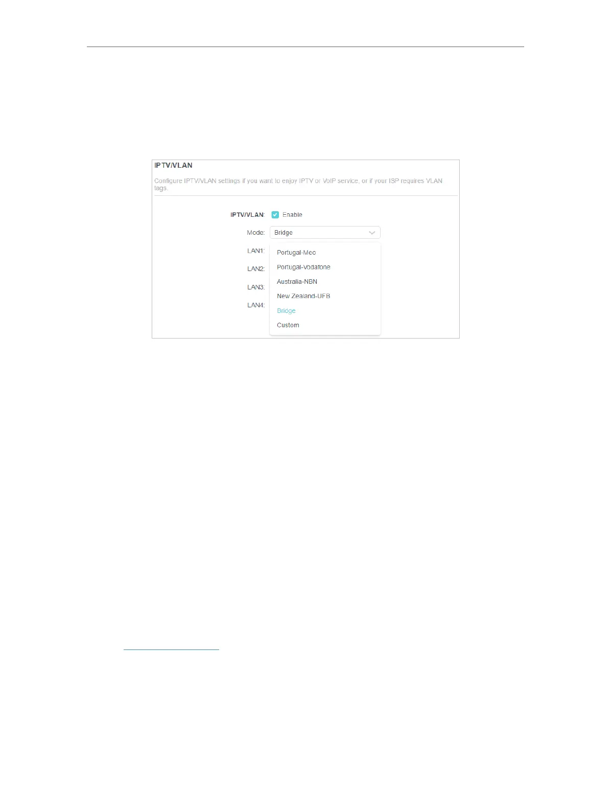 Select Bridge if your ISP is not listed and no other parameters are required.