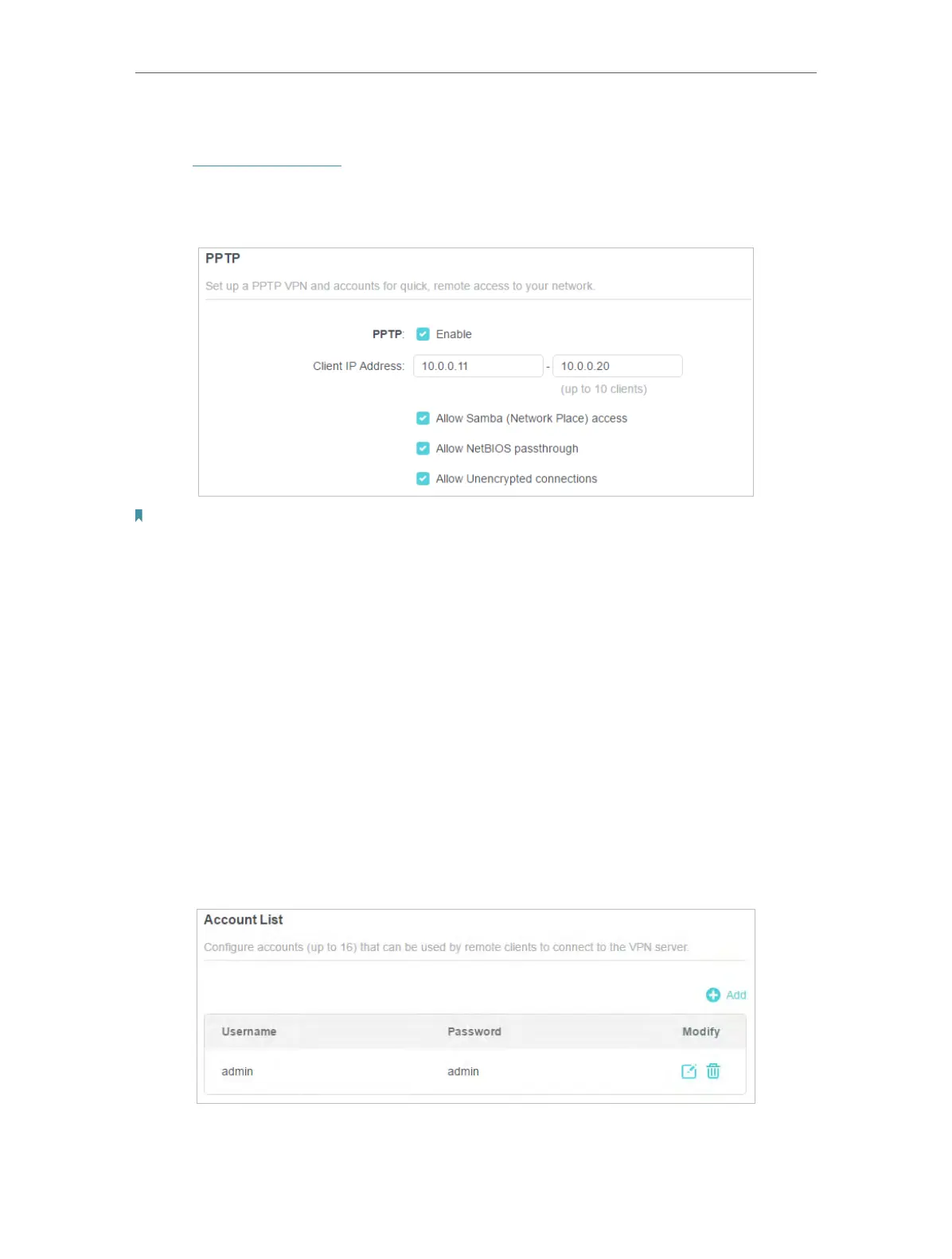 6. Configure the PPTP VPN connection account for the remote device. You can create