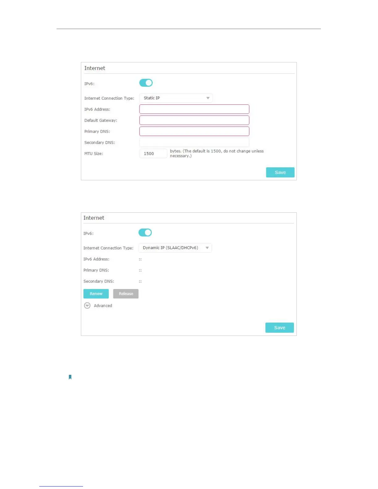 2 ) Dynamic IP(SLAAC/DHCPv6): Click Advanced to input further information if